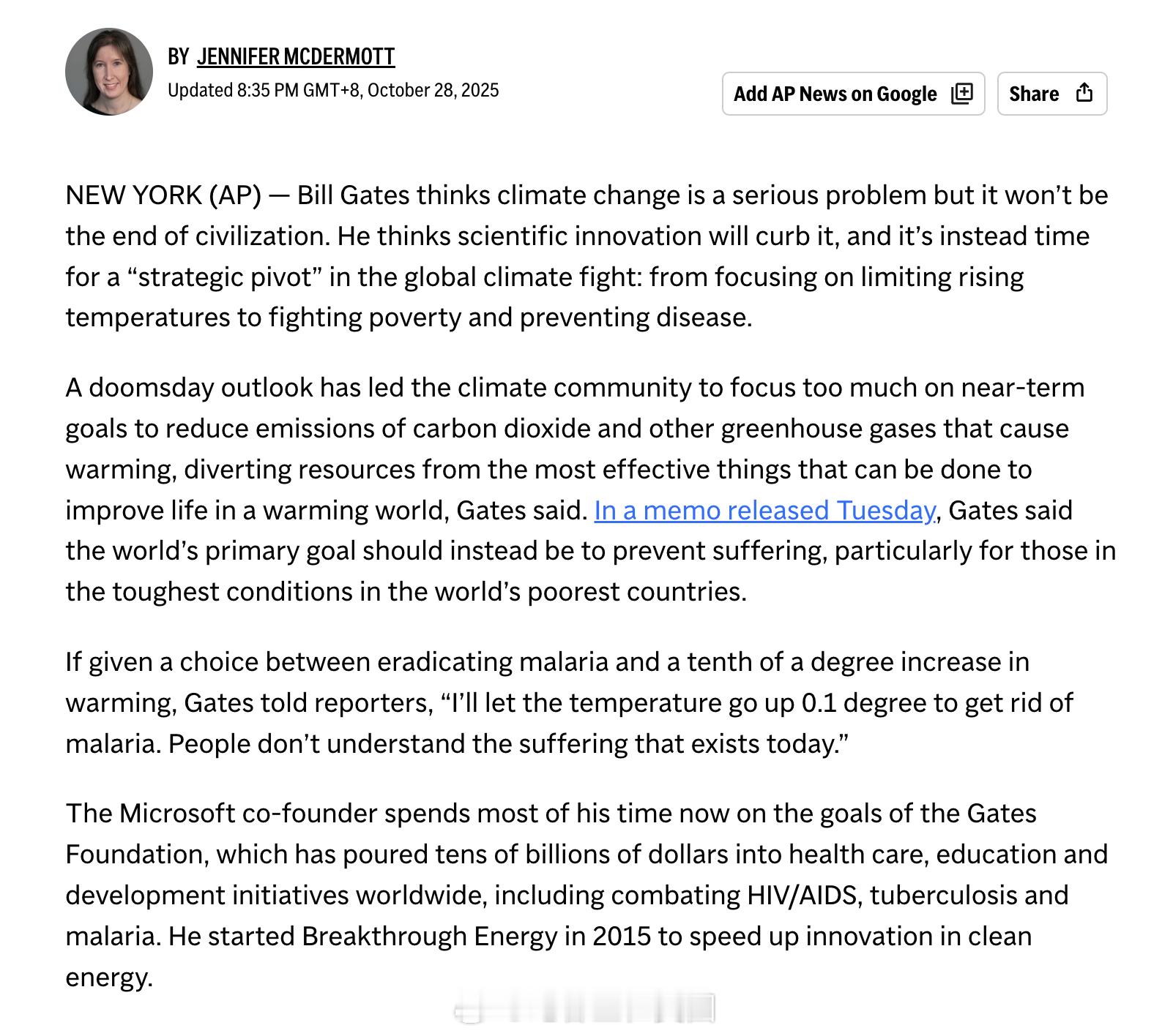 盖茨认为,气候变化虽严重,但不会终结文明;与其执着于短期减排目标,不如将重点转向减贫和防治疾病。他主张全球气候行动应以减少人类痛苦为核心,尤其关注贫困国家的人民。盖茨表示,如果能以气温上升零点一度为代价消灭疟疾,他愿意这样做。