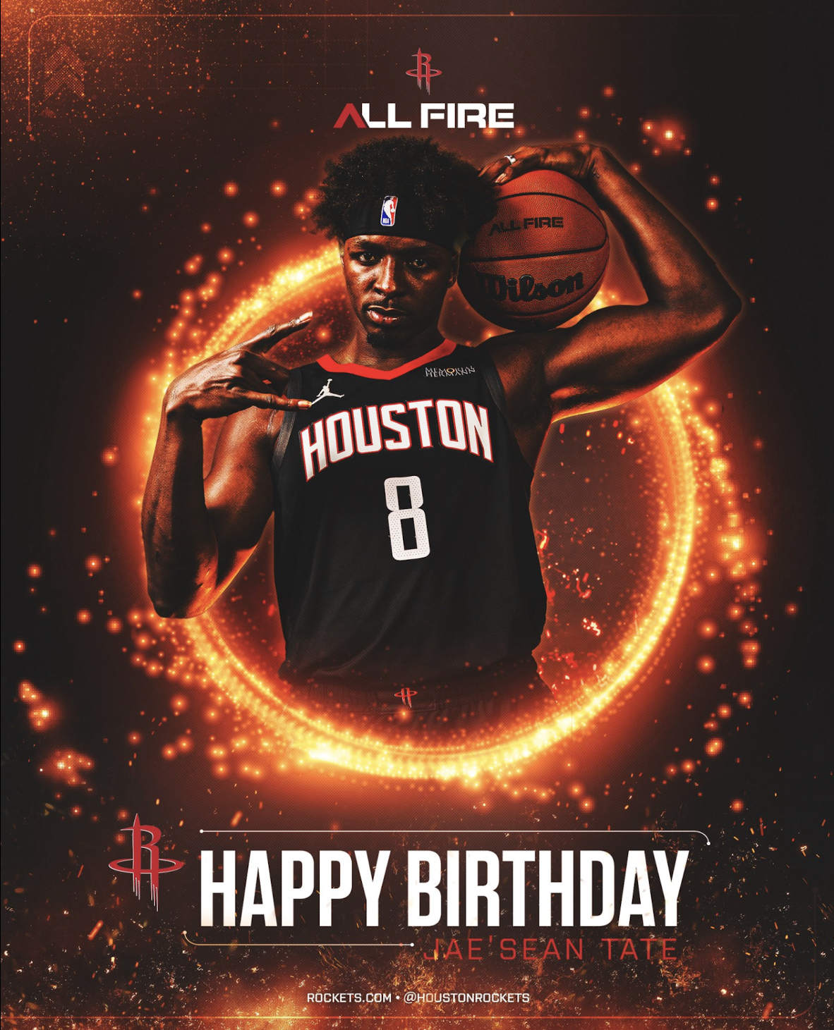 虎扑10月29日讯火箭官媒更新了X,晒出一张火箭球员杰肖恩-泰特的照片并为其献上生日祝福。