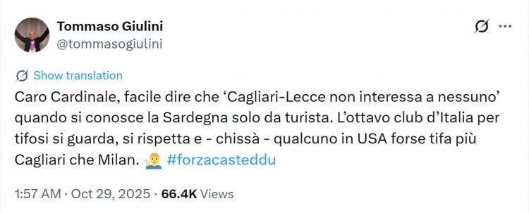 朱利尼写道:“亲爱的卡迪纳莱,当你对(卡利亚里主场所在地)撒丁岛的了解仅限于游客视角时,说‘没人关心卡利亚里对阵莱切的比赛’当然容易。作为意大利球迷数量排名第八的俱乐部,卡利亚里既有观众关注,也备受尊重。而且谁知道呢,在美国,或许支持卡利亚里的人比支持米兰的还多(注:在美国有很多来自撒丁岛移民的后裔)。”