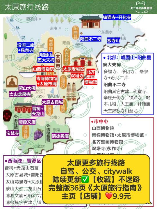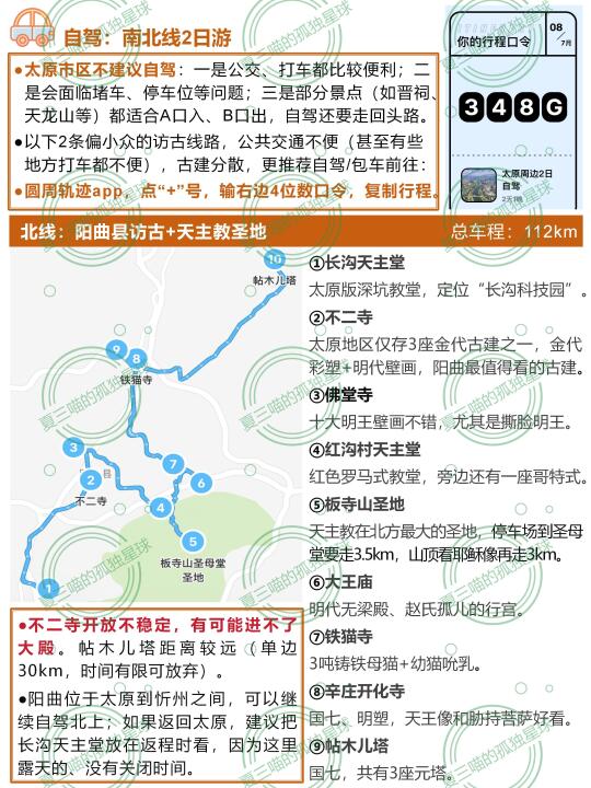 欢迎打开夏三喵的第[九R][二R]篇山西笔记! 完整版106页《山西旅行指南》[向右R]评论自取 —— [种草R]古建小众、冷门,有探索的乐趣 阳曲是“三晋首邑”,难得是节假日游客也不多。 [一R]不二寺[poi_v2] 阳曲古建扛把子! 始建于北汉时期,历经宋、金、元、明、清多次修缮,现存三圣殿为金代遗构,是太原地区仅存的3座金代建筑之一⚠️另2座是晋祠献殿、清源文庙大成殿。 三圣殿内有9尊金代泥塑,文殊、普贤的左右位置与传统寺院相反、体现初北汉的礼制特色;东西山墙绘有明代壁画137㎡,色彩绚丽。 [二R]佛堂寺 十大明王壁画不错,尤其是撕脸明王。 [三R]大王庙 传说曾是晋国大夫赵武(赵氏孤儿主人公)最后的行宫。 明代无梁殿,悬梁吊柱结构特色,有民俗壁画。 [四R]轩辕庙 十二药王壁画,很多碑刻遗存。 [五R]铁猫寺[poi_v2] 3吨铸铁母猫+幼猫吮乳。 [六R]辛庄开化寺 国七,有相当不错的明塑,天王像和胁持菩萨好看。 [七R]帖木儿塔 国七,共有3座元塔,中为石塔,东西为砖塔。 —— [种草R]北方最大的天主教圣地,教堂✖️5 山西多寺庙,教堂也不少,且建筑有特点。 [八R]板寺山圣母堂圣地[poi_v2] 板寺山海拔1760米,圣母堂始建于19世纪,占地3万㎡,据说由梵蒂冈教皇批准兴建,是北方最大的天主教圣地。 从停车场到圣母堂要走3.5km,到山顶看耶稣像还要再走3km。 [九R]红沟村圣心天主堂 红色罗马式教堂非常抢眼,旁边还有一座哥特式的安多尼天主堂。 村子在板寺山山脚,从这里上山还会经过王家垴村天主堂。 [一R][零R]长沟村天主堂(导航长沟科技园) 1921年由意大利传教士建造,因煤矿开采造成地层塌陷,教堂主体结构严重受损,但“陷而不塌”,目前依然坚强地屹立着,看着类似“深坑教堂”,因劫难反成奇观。 —— 🐱喵的补充 🔸不二寺开放不稳定,进了大门三圣殿也可能锁着,比较靠谱是初一十五去。 🔹帖木儿塔离其它古建较远(单边30km),可看可不看。 🔸如果太原往返,建议把长沟天主堂放在返程,因为这里是露天的、日落格外有氛围。 —— 预告 《清徐:比阳曲游客还少的小城》 更多小众好地方[向右R]