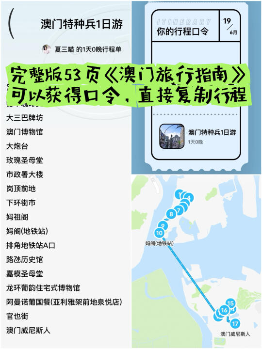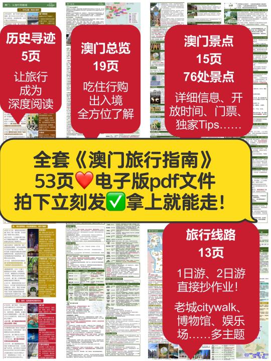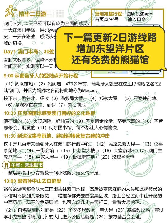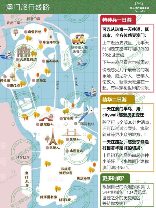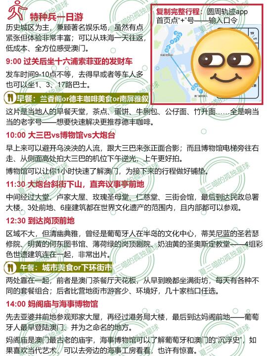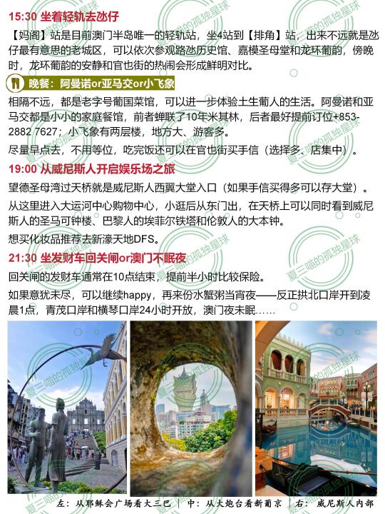 去过不下20次澳门,花了34天才完成52页《澳门旅行指南》[向右R]评论自取 然后,再浓缩成这份1日游! 🔸历史城区为主,兼顾著名娱乐场; 🔹珠海一天往返,低成本、全方面感受澳门。 —— 9:00🚌过关后坐十六浦索菲亚的发财车(时间更早可以坐1、3、17路巴士) 早餐🥗兰香阁or德丰咖啡美食or南屏雅叙 当地人的早餐天堂,要啥有啥。 9:40[种草R]大三巴牌坊[poi_v2] vs澳门博物馆[poi_v2] 早上来可以避开乌泱泱的人流,跟大三巴来张正面合影(⚠️人多时的宝藏机位看图片) 11:30 [种草R]大炮台斜街下山,直奔议事亭前地[poi_v2] 中间经过大8处世遗、内部都可以参观。 12:30 [种草R]到达岗顶前地[poi_v2] 圣若瑟修院、何东图书馆、岗顶剧院、圣奥斯定教堂——4组彩色世遗建筑连在一起,非常出片。 午餐🥗城市美食or下环街市 前者是澳门茶餐厅天花板,后者比营地街市游客少、环境好。 14:00[种草R]妈祖阁[poi_v2] 与海事博物馆[poi_v2] 先去亚婆井前地参观郑家大屋,再经过港务局大楼到达妈阁前地——葡萄牙人最早登陆澳门的地方。 15:30🚆坐着轻轨去氹仔 【妈阁】站是目前澳门半岛唯一的轻轨站,坐4站到【排】角站,可以依次参观路氹历史馆、嘉模圣母堂和龙环葡韵。 晚餐🥗阿曼诺or亚马交or小飞象 相隔不远,都是老字号葡国菜馆,5点左右就去不用等位,吃完在官也街买手信。 19:00[彩虹R]从澳门威尼斯人[poi_v2] 开启娱乐场之旅 望德圣母湾过天桥就是西翼大堂,闯过大运河中心购物中心从东门出⚠️天桥上可以同时看到威尼斯人钟楼、巴黎人埃菲尔铁塔和伦敦人大本钟。 21:30🚌坐发财车回关闸[poi_v2] 回关闸的发财车通常在10点结束,提前半小时比较保险。 意犹未尽可以去吃水蟹粥,反正拱北口岸开到凌晨1点,青茂口岸24小时开放。 —— 预告 52页《澳门旅行指南》刚刚上架,会陆续更新。 下一篇➡️《精华2日游线路》 更多大湾区好地方[向右R]