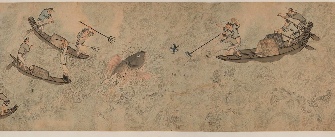 古画中的大鱼,我在奉新仰山也见过 晚明孙克弘的这幅《鱼乐图卷》(局部)古画还是蛮有趣的,其中最有趣的片段是众人合捕大鱼,有一点现实魔幻主义的感觉。 类似这样的大鱼我其实也多次听人说起过,但实地亲眼所见则只有一次。大概是2012年吧,在奉新仰山的街道集市上,有人在集上贩卖一条很大很大的鱼,好几个客户购买之后,大鱼依旧剩下很多。这条大鱼,据说来自街道北面的香坪水库。