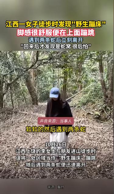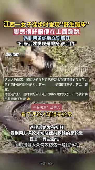 “真是命大啊!”江西,一女子在徒步时,遇到一片堆满落叶的地面,踩上去弹弹的,起初以为是原生态蹦床,不料竟是眼镜蛇窝!   事情的起因是,10月26日的时候,王女士(化名)和闺蜜商量好一起去山里面徒步,于是她们二人一大早就出发,背上轻便的双肩包,里面装着水、零食、登山杖和应急小物件。   空气里带着山林的清新味道,晨雾还没散尽,阳光透过树叶洒在潮湿的泥土上,地面有些滑,踩上去发出“咯吱咯吱”的响声。   她们边聊边笑,谈着日常琐事,也时不时停下脚步拍照,捕捉林间阳光和山景的美丽,然而就在她们沿着山道走着走着,忽然眼前出现一片厚厚的落叶覆盖的地面,金黄和褐色的叶子堆得松软而厚实。   王女士出于好奇就伸脚踩了上去,这时候她顿时感受到整个人微微下沉又被叶子轻轻托起,紧接着就喊闺蜜也跟着踩了几下,两人都被这种弹弹的感觉逗乐了。   起初,王女士以为这是大自然的“原生态蹦床”,于是就让闺蜜在一旁用手机记录她蹦跳的过程,不料没过一会,就从王女士的脚底下爬出来了一条蛇,吓得王女士和闺蜜二人慌忙逃走了。   历经三小时的徒步之后,王女士出了大山一有信号,就将徒步时在草丛里蹦跳的视频翻出来,发到了短视频平台上面,原本想着让网友帮忙科普一下是怎么回事,不料看了网友的评论之后,令她感到后怕。   事后网友刷到了之后,有一位网友在下面评论说,像这样的草丛里面是蛇的窝,是它们在准备过冬的地方。   看到这条评论之后王女士整个人瞬间心跳加速,手里的手机差点掉落,那条本以为安全的落叶堆,此刻变成了潜藏危险的蛇窝,后来她回想起当时自己踩下去的弹感,才意识到,每一次踩踏都可能惊动蛇,她浑身一阵凉意。   还有一些网友在下面调侃说,好在王女士在蹦跳的时候戴着“鸭舌帽”,所以不用害怕。   调侃归调侃,这次徒步经历,差点让王女士付出惨痛代价,也提醒我们自然虽美,却潜藏危险,轻松的娱乐与安全之间,往往只隔着一层警觉。   即便是一片看似平常的落叶堆,也可能隐藏危险,幸运逃过一劫固然值得庆幸,但更重要的是从中吸取教训,尊重自然、谨慎行事,才能真正安全地享受户外的美好。   遇事不要掉以轻心,尤其在野外活动时,一定要留意环境,保持谨慎。   对此,你还有什么看法呢?   (信息来源 :浪潮新闻 )