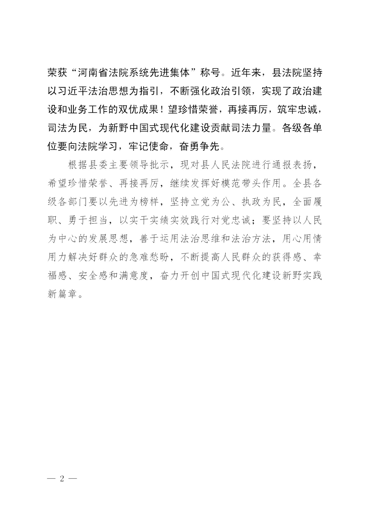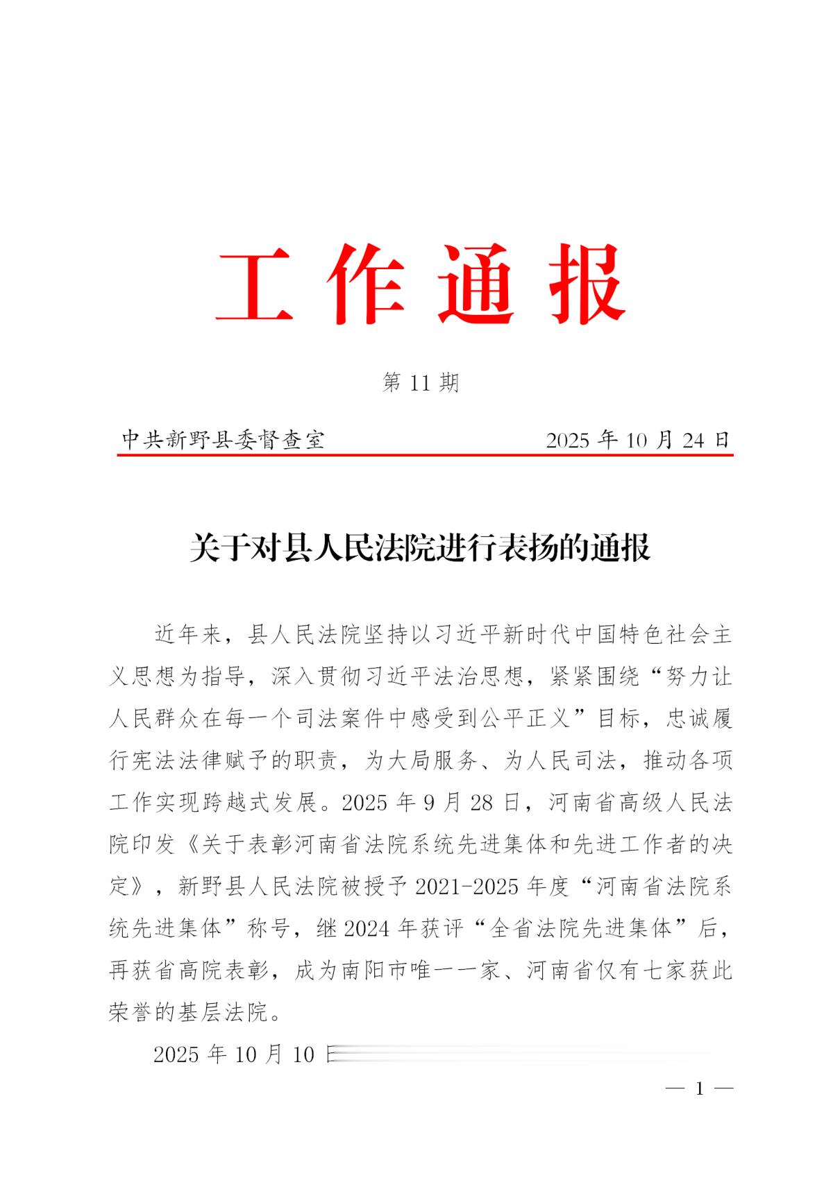 2025年9月28日,河南省高级人民法院印发《关于表彰河南省法院系统先进集体和先进工作者的决定》,新野县人民法院被授予2021-2025年度“河南省法院系统先进集体”称号,继2024年获评“全省法院先进集体”后,再获省高院表彰,成为南阳市唯一一家、河南省仅有七家获此荣誉的基层法院。