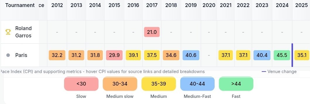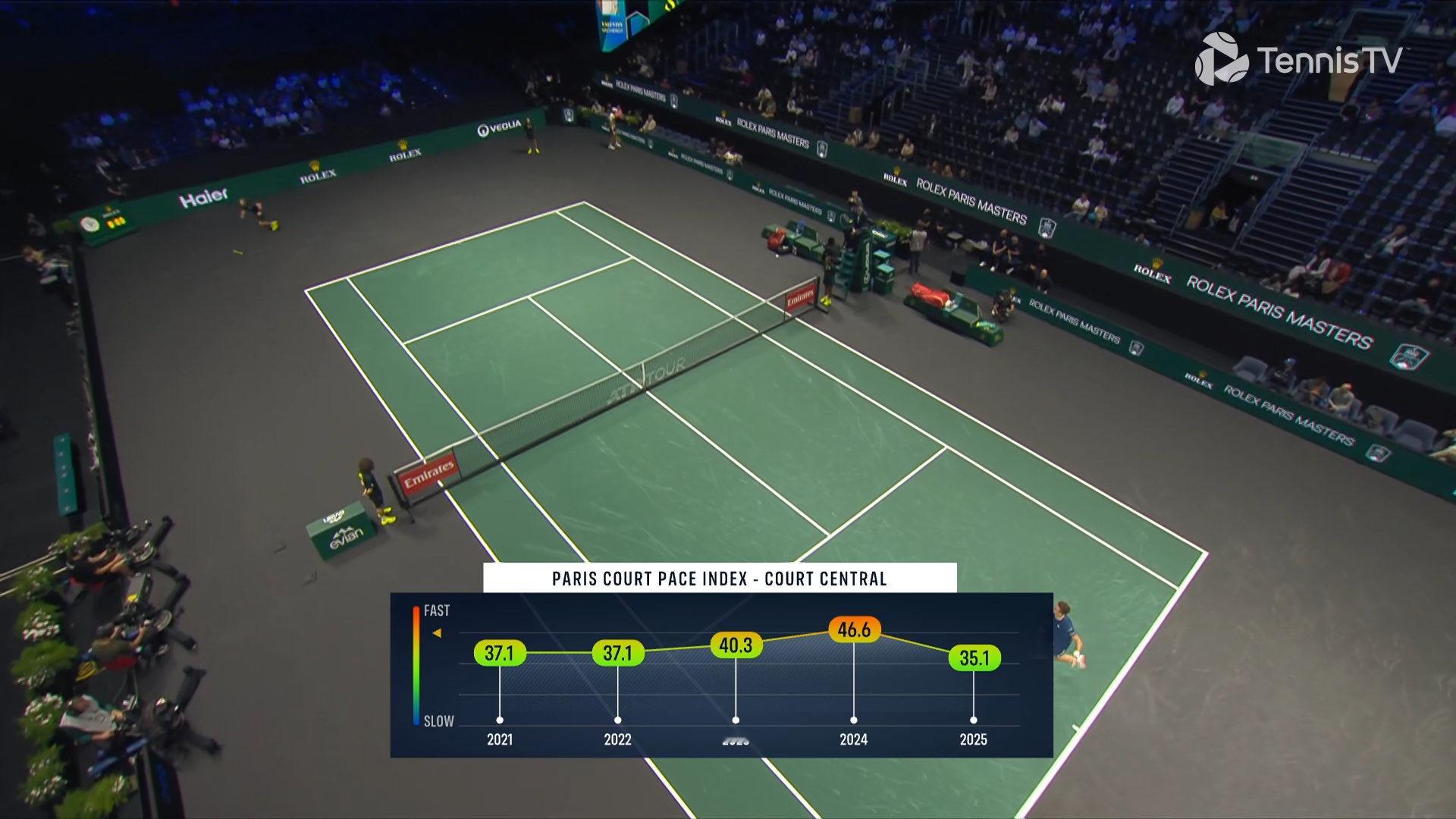 今年巴黎大师赛的场地速度只有35.1,比起去年46.6全面下降,但其实与这项赛事过去13年的35.75平均球速非常接近。