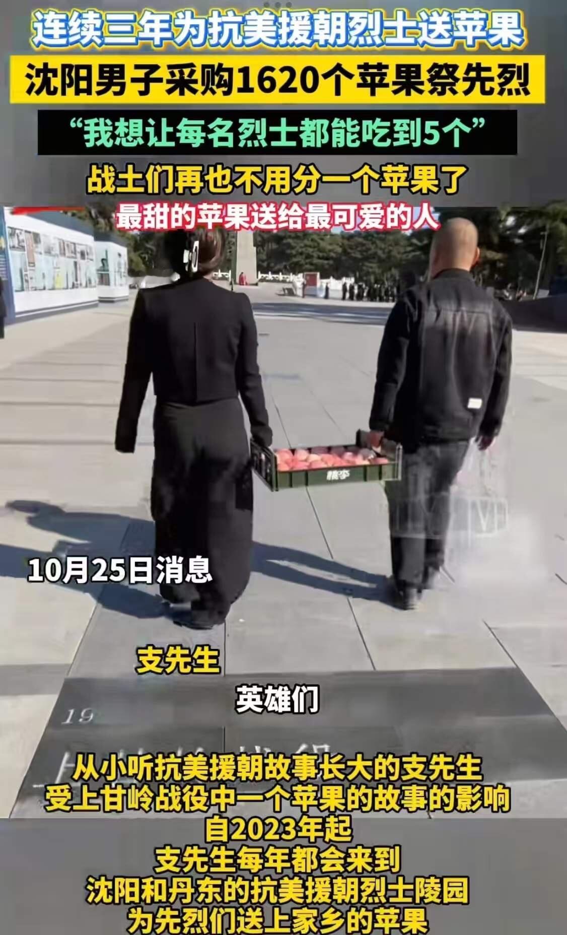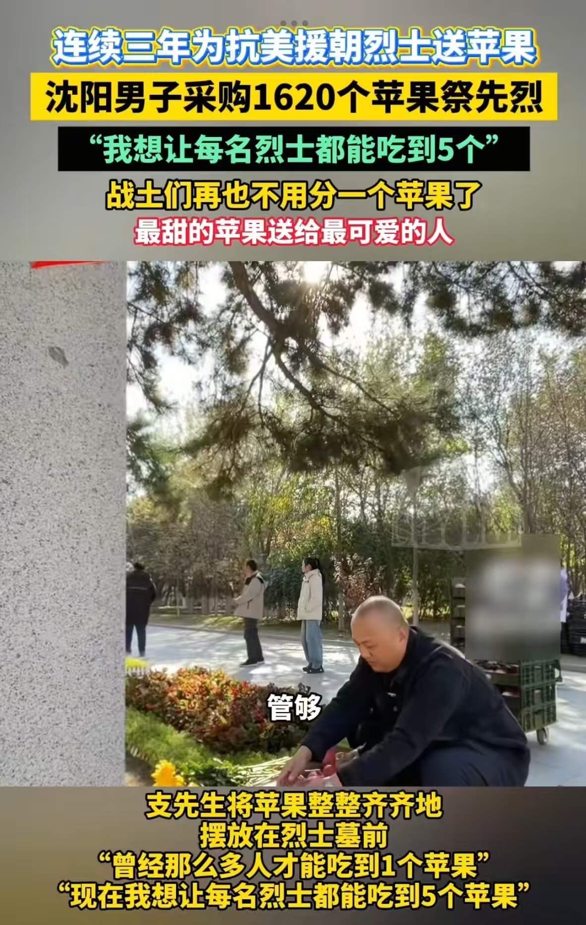 一大早就被感动哭了!沈阳,47岁男子带着1650个苹果来到丹东烈士陵园,然后在每个墓碑前放上5个苹果,就为了圆一个藏在心底多年的念想——当年上甘岭的战士们,8个人才分得一个苹果,而现在,他要让每一位烈士都能吃上5个! 这不仅仅是一份简单的献礼,更是一场跨越时空的深情对话。在那个硝烟弥漫、战火纷飞的年代,士兵们用生命守护国家,用鲜血书写了不朽的英雄篇章。而今,一个普通男子用如此细腻、感人的方式,唤醒了我们对那些为国捐躯的英雄们最真挚的敬意。 或许有人会问:一个苹果,能代表什么?但在我看来,这正是那份微小却深沉的尊重。那8个战士仅分得一个苹果的场景,折射出战争的残酷与士兵们的无私。而今天,这个男子用1650个苹果,试图补偿那段被剥夺的“温暖”,让每一位烈士都能享受到“多一点的关怀”。 你是否曾在深夜静思?那些为国抛头颅、洒热血的烈士们,他们用生命换来了我们的和平与幸福。我们是否也应像这位男子一样,用心去体会那份沉甸甸的责任?或许,我们都可以从身边的小事做起——多一份理解、多一份善意、多一份敬重。因为,英雄不只存在于史册,也在我们每个人的心中,只要我们愿意去关心、去传递。 这件事让人反思:我们在追求个人梦想的同时,是否也该关心那些曾经为我们筑起和平砖石的人?他们的牺牲,是我们今天幸福生活的坚实基石。我们是否也能用一份行动,去表达那份跨越时空的感动?也许只是一次简单的问候,一句暖心的话,或者像这位男子一样,献上一份象征敬意的苹果。 每一个英雄的背后,都是一段不为人知的牺牲与坚持。今天,我们用这1650个苹果,向他们致敬,也希望每个人都能在自己的岗位上,做出点滴的善行,把那份尊重和爱传递下去。因为,真正的英雄精神,不在于战场上的拼杀,而在于日常生活中那份细腻的关怀与坚持。 让我们记住这份感动,也希望每个人都能在平凡中找到不平凡的力量——那是对过去最好的缅怀,也是对未来最真切的期盼。英雄永存,不仅仅在烈士的墓碑前,更在我们每个人的心中,等待那一份用心的行动,去延续那份光荣与梦想。朝鲜志愿军陵园 辽东烈士纪念塔 沈阳烈士陵园