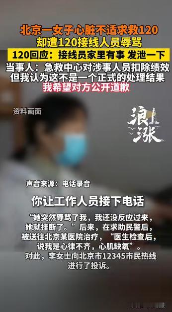 “严查到底!”10月11日,北京,一女子外出过程中,突然感觉心脏不舒服,于是她立即拨打了“120”求助,可接线员却非常不耐烦,不仅辱骂女子,还直接挂断电话!女子只能求助民警,这才顺利抵达医院救治。网友:这简直就是在害命!   据浪涨新闻,一名女子在外出的时候突然感受到她的心脏很不舒服,于是就赶紧拨打了急救电话,不料这时侯却因为描述不清楚所处位置被医护人员大骂了一通。   事情的起因是,李女士(化名)当天因为事情外出,然而就在她沿着通州区小甸屯的道路行驶,路途经过综合检查站时,突然感觉胸口一阵压迫,心跳异常急促,呼吸也开始有些困难。   她的额头冒出了细密的汗珠,手不由自主地紧握方向盘,整个人顿时有些发怔。   意识到情况不对,她立刻把车靠边停在检查站旁,掏出手机,手指因为紧张微微发抖,却仍然迅速拨打了“120”。   接通之后工作人员立马就询问李女士位置,这时候由于她身体实在不舒服,再加上也第一次来,于是在描述自己所在的具体位置时有些含糊。   想不到的是,电话那头的急救中心接线员听到模糊的地名后,语气立刻变得不耐烦,声音提高,带着责备意味,“你到底在哪儿啊,说清楚点!”   李女士试图再解释几次,但因为紧张和呼吸不畅,话语断断续续,接线员不但没有耐心等待,还开始辱骂她,几秒钟后,电话被毫无预警地挂断,李女士只听到“嘟”的一声结束音。   无奈之下,李女士打电话向民警求助,民警迅速反应,赶到了之后立马开车一路护送李女士,最终经过医生的专业处置之后李女士已经没有什么大碍了。     但对于这次的这种情况,李女士立马就向有关部门进行了投诉,这时候接线人员说她之所以这样做并不是针对李女士个人,而是因为那天家里闹了一些不愉快,所以脾气不好。     这时候相关部门的处理动作也十分的迅速,说要扣除接线人员这个月的绩效作为惩罚,然而在李女士的眼里面只扣除绩效是远远不够的,要求接线人员公开道歉。   事后这件事情被网友刷到了之后,一些网友在下面评论说,好早这次有民警及时出手,不然的话要是李女士真的出现什么生命危险,接线人员得愧疚一辈子。   此外还有一些网友觉得接线人员的做法很不负责,作为一名医护人员就不应该将家庭里面的负面情绪带到工作中来,要对每一个需要求助的患者负责。   这起事件让人感到震惊和无奈,当生命出现紧急情况时,求助本应得到及时、耐心的回应,却遭遇了冷漠和粗暴的对待,幸运的是,民警及时出手,才让女子顺利抵达医院,得到了必要的救治。   那么通过这件事件也提醒我们,急救服务不仅是技术和流程,更承载着责任与生命的重量,任何一分冷漠和不耐心,都可能危及生命。   希望相关部门严查到底,加强接线员培训,确保每一次“120”电话都能成为真正的生命保障,而不是危险的源头。   对此,你还有什么看法呢?    (信息来源 : 浪涨新闻 )