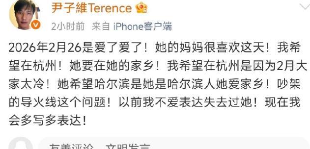 尹子维昨天半夜情绪失控,连发数十条动态,邀请大家在2月26日,参加他一个人的婚礼,同时透露徐冬冬将不会参加,但是自己还是要为她办! 看着尹子维独自“发疯”,网友们都懵了,第一反应是不是他又喝酒了开始疯言疯语,或者是和徐冬冬的感情出现了问题,婚礼怎么可能一个人举办? 徐冬冬今天才回应,表示翻篇,婚礼还是会在哈尔滨举办,看样子还是因为婚礼场地的原因闹矛盾,现在也已经有了结果。 不过尹子维这一言不合就发动态的行为,还是让网友有些意外,这是发泄还是利用舆论给徐冬冬施压呢? 俩人从 2017 年因戏结缘,差了 15 岁,感情之路就没顺过,2019 年尹子维搞火锅藏钻戒求婚,热闹没多久就官宣分手,后来尹子维花了四年时间死缠烂打,天天发思念日记,每年给徐冬冬生日点赞,才在 2023 年追回人复合。本以为订婚了就能顺顺利利结婚,没想到卡在了婚礼地点上! 尹子维想在杭州办,觉得俩人定居在这,筹备方便、亲友也集中,还担心 2 月的哈尔滨零下二三十度,宾客冻得遭罪,特意提了杭州主仪式 + 哈尔滨流水席的折中方案。 可徐冬冬是铁了心要回哈尔滨,不仅因为妈妈喜欢 2 月 26 号这个 “爱了爱了” 的谐音日,更想在家乡办不收礼金的传统流水席,把婚礼办得接地气,还想邀请网友一起热闹。 俩人性格压根不合拍!尹子维是典型的 “恋爱脑”,啥都想晒出来,不管是探店还是直播,都想拉着徐冬冬出镜,可徐冬冬早就划清界限,想专注自己的事业,不想把感情当引流工具。一个想高调秀恩爱,一个想低调过生活,这场矛盾其实早就埋下了伏笔。 而且明明私下能沟通的事,非要闹到全网皆知,到底是情绪失控发泄,还是故意用舆论给徐冬冬施压? 有网友吐槽这是 “情感绑架”,把私人矛盾摆上台面,让徐冬冬骑虎难下;也有人心疼尹子维,觉得他是太爱了才慌了神。但说句实在的,婚姻是两个人的事,再大的分歧也该关起门来商量。 能兜兜转转七年,从分手到复合再到订婚,感情基础还是有的。只要各退一步也不是没商量的余地。徐冬冬的回应也给了台阶,估计后续会把婚礼细节理顺,毕竟最伤感情的事,就是过日子的时候老吵架! (每天更新,欢迎关注,喜欢文章的可以帮忙点个赞留条评~) 对此大家有什么看法?