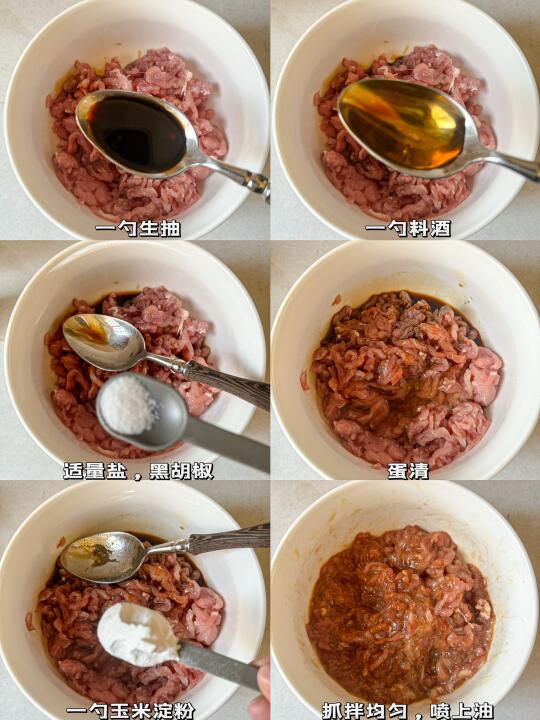 1️⃣里脊肉丝➕一勺生抽➕一勺料酒➕适量盐,黑胡椒➕一勺玉米淀粉➕一个鸡蛋清抓拌均匀,喷油锁住水分,腌制50分钟