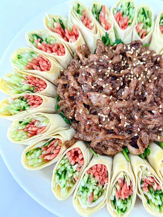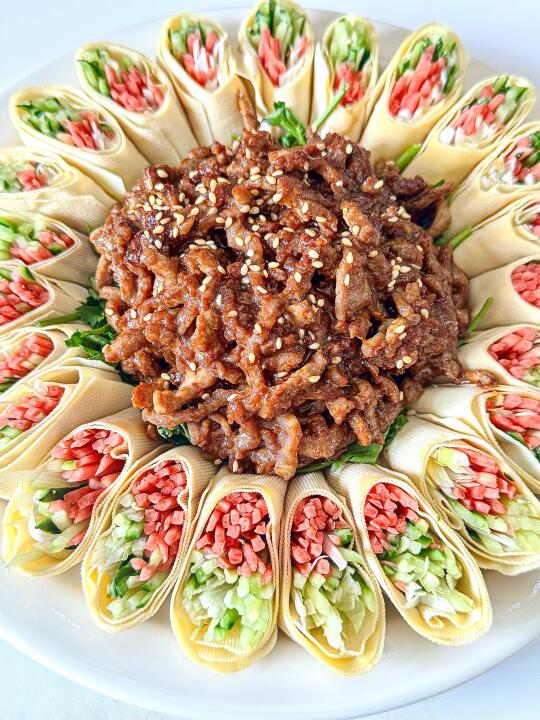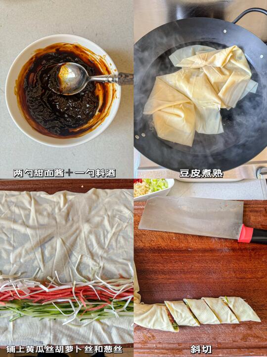 2️⃣豆皮焯个水,卷入黄瓜丝、胡萝卜丝、葱丝,切开摆盘!用香菜铺个底!
