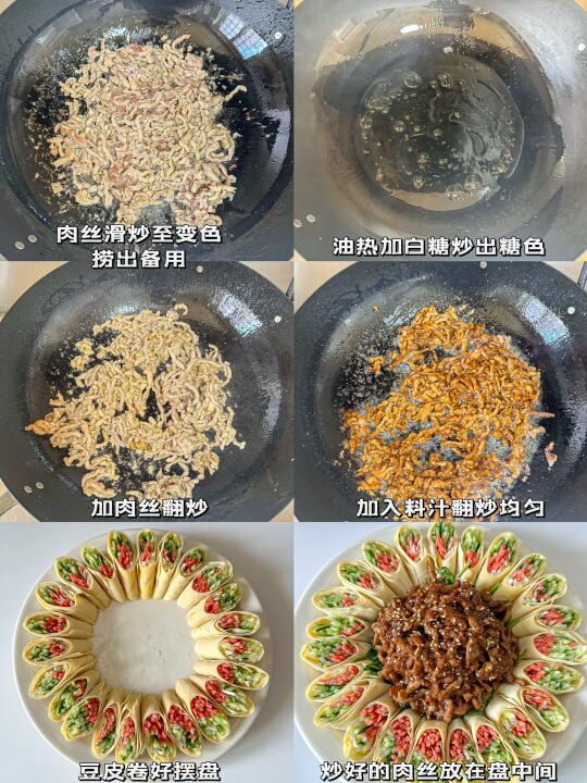4️⃣留少许油➕白糖,炒出糖色!倒入拌好的甜面酱,炒出香味,再➕少许淀粉水勾芡。然后倒入肉丝,翻炒均匀即可!