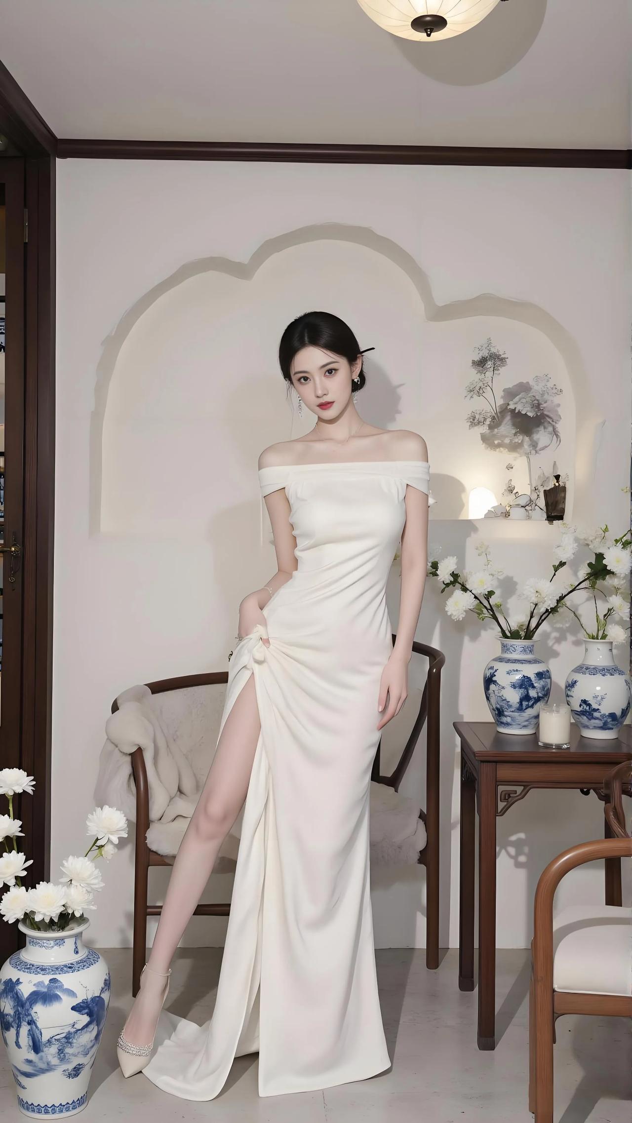 青花几案白菊繁,露肩旗袍倚画轩。 朱门半启风姿现,旗袍裹身似凝烟。 弧墙淡墨