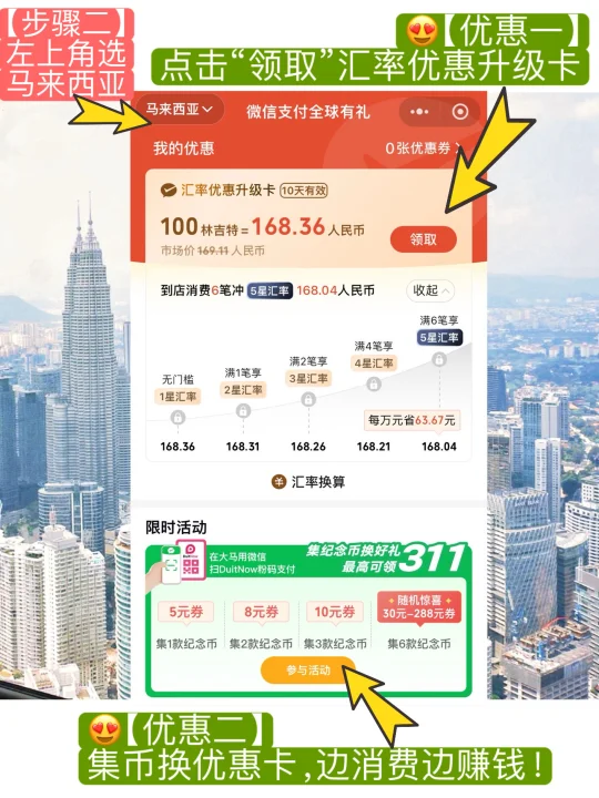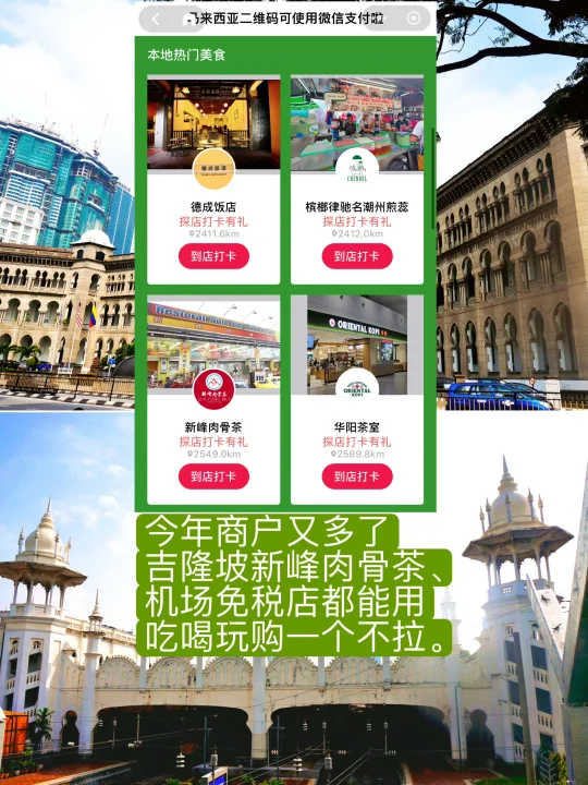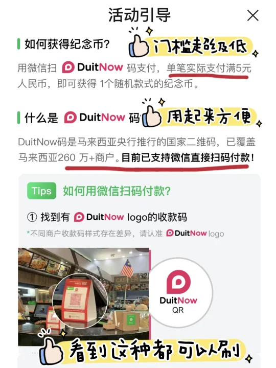 马来西亚是东南亚旅行的“隐藏王者” 🔸社会稳定度高,安全系数仅次于新加坡; 🔹海岛不用说了,东马yyds,躺平、浮潜、深潜都很惬意; 🔸槟城、怡保、马六甲是华裔聚居地,风情十足的南洋建筑+各种美食,逛吃天花板! 🔹文化多元:伊斯兰教、基督教、佛教、印度教……逛荷兰城堡,住英国避暑别墅。 🔸免签,可以说走就走!亚航总部,经常有超低价机票! —— [彩虹R]7天这么玩看精华 这次主要是打算带父母去,设计了一个紧凑又丰富的行程(直接抄作业!) D[一R] 马六甲 直接住老城,骑自行车去荷兰广场、鸡场街、炮台⚠️关键是海峡清真寺蹲日落! D[二R]-[三R] 吉隆坡 国家清真寺能刷新对伊斯兰教的认识,独立广场周围的各种建筑,晚饭阿罗街大吃一顿然后散步去双子塔——纠结要不要去吉隆坡塔,看景还可以,但自助餐水平实在普通。 D[四R] 金马仑 50%为了Smokehouse(7年前住过,超喜欢[色色R])、50%为了吃火锅(没错我一个四川人要专门去马来西亚吃!各种菜都超清甜,推荐清汤和冬阴功汤底)。 当然对于没去的人,寻找大王花才是目的;至于茶山咖啡,我觉得不如泰国美斯乐。 D[五R] 怡保 就是一部活生生的怀旧片、王家卫电影feel。 D[六R]-[七R] 槟城 以吃而论,槟城是我心中的东南亚天花板、没有之一! 这里很适合漫无目的地走街串巷,各种南洋老房子、小店、街头涂鸦…… —— [钱袋R]关键是,最近去超级划算! (具体看📸图10-15) 1️⃣微信支付的汇率优惠又升级了!用的越多越划算😍 2️⃣集币换代金券,30换311元! ✅消费5元就能获得一个币,集齐6款币能获得最高311元代金券! ✅理想情况下,花30元能得到311元,投入产出比高达1037%,简直是暴利! ‼️划重点! ▪️线下用微信扫“DuitNow粉码”,单笔满5元即可获得1枚随机“纪念币”。 ▪️可以和别人换币,能很快集齐,轻松拿优惠。 ▪️代金券是阶梯式的,1款5元、2款8元、3款10元,集齐后一次性还能领30-288元。 3️⃣扫码购物超方便! DuitNow粉码是马来西亚央行推的国家二维码、覆盖260多万商户。 扫码就能支付,比现金、刷卡都方便,而且汇率更划算。