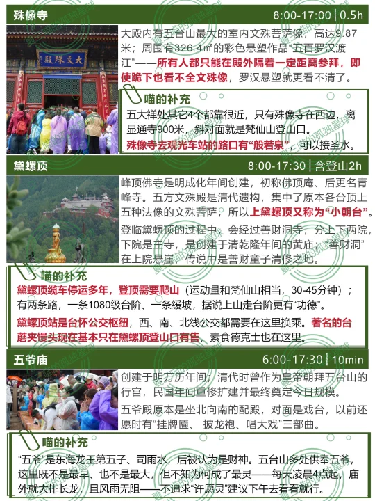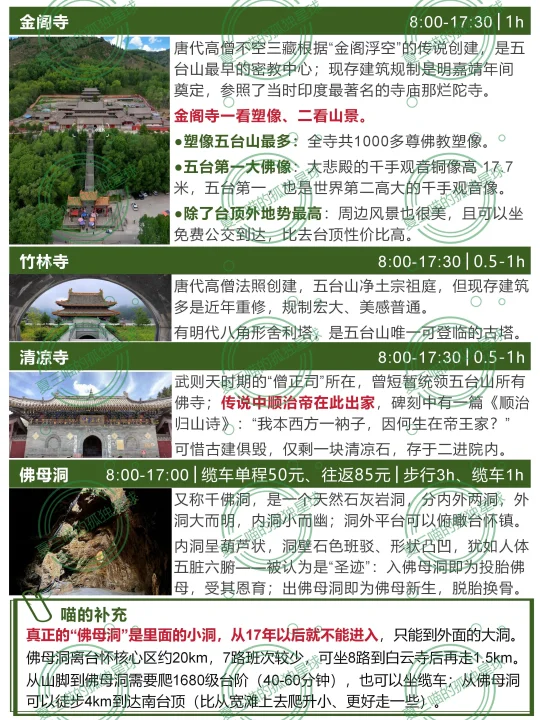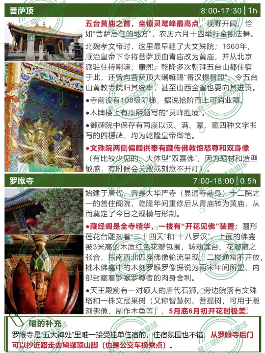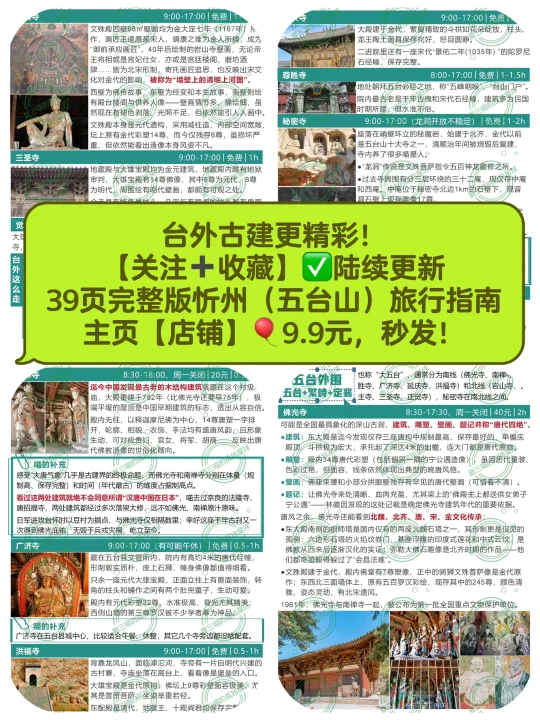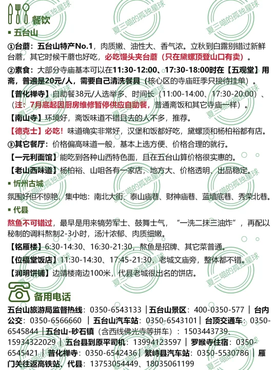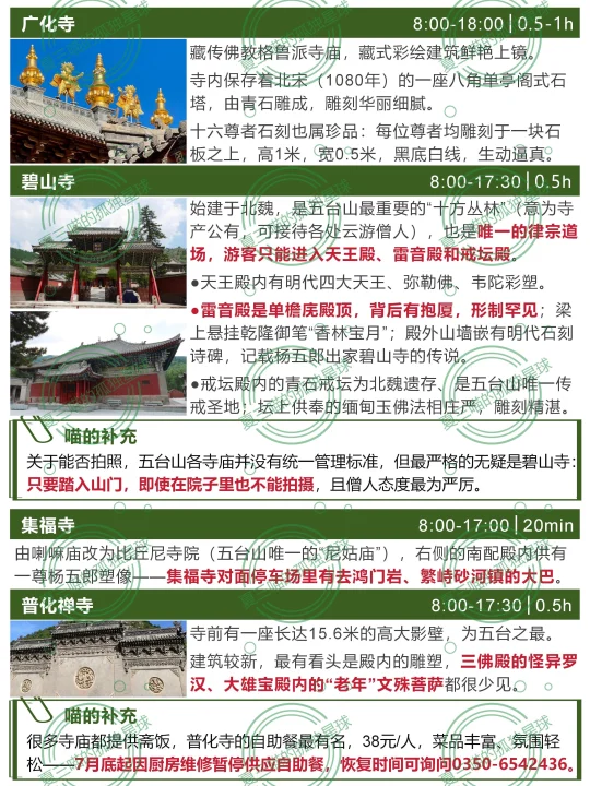上篇笔记疯狂吐槽五台山,近百条评论居然全是赞同的[捂脸R][捂脸R]都是不满,为什么还有那么多人去?且有些还去了又去?(比如我自己) 对佛教徒➡️毫无疑问的圣地,“人间佛国” 对徒步爱好者➡️“大朝台”是华北经典线路 对古建爱好者➡️全国唯一集齐唐、宋、金、元、明、清、民国历代建筑的地方 ▪️佛光寺和南禅寺是“活着的大唐” ▪️岩山寺是宋金交替的一声叹息 ▪️广济寺和洪福寺是金元彩塑的惊喜 ▪️公主寺凝固了大明风华 —— [彩虹R]五台山由内向外有4圈 各寺详细看点见📸图2-11 1️⃣核心区:1.5km内,步行1天可游玩全部 “五大禅处”(显通寺+塔院寺+菩萨顶+罗睺寺+殊像寺)、黛螺顶、五爷庙、广仁寺、广化寺、梵仙山…… 2️⃣台怀镇景区内:全线覆盖免费公交 ▪️北线:集福寺、碧山寺 ▪️南线:普化禅寺、南山寺、镇海寺、明月池、佛母洞…… ▪️西线:龙泉寺、竹林寺、金阁寺、清凉寺…… 3️⃣大朝台:连接5大台顶的环线(▶️下篇细说) 部分区域属于景区管理、朝台车由景区统一运营,徒步2-4天,朝台车 4️⃣台外:景区外,自驾1-2天 ▪️北线:岩山寺>公主寺>三圣寺>秘密寺>>>>>正觉寺(可弃),只看前3个半天就行。 ▪️南线:佛光寺>南禅寺>>广济寺=洪福寺>延庆寺>>尊胜寺,自驾/包车一天刚好。 —— 🏠台内住哪儿?吃什么? 详见📸图16-17 ▪️首选:杨柏峪附近(山咀到普化禅寺) 公交最方便,吃住选择多,想要少走路选靠近砂石线、离8路车站点近的住宿就行。 ▪️只玩一天:黛螺顶站,walk核心区 ▪️公交性价比:8路沿线,价格比杨柏峪低 ▪️旺季自驾想省钱:景区外南门到山咀之间 ⚠️连锁酒店更有保障、但同样条件比民宿型贵约30%,淡季walk in价格更低。 ⚠️寺庙“挂单”推荐普化禅寺,交通方便斋饭好吃,大通铺睡四个人、100元/人;罗睺寺、广化寺条件好但很少对外,要找代理。 ‼️台蘑必吃[色色R]德克士必吃[色色R] 斋饭推荐【普化禅寺】和【南山寺】 【一元利面馆】少见的实惠地方 【老山西味道】胜在价格透明、出品稳定 更多小众旅行地