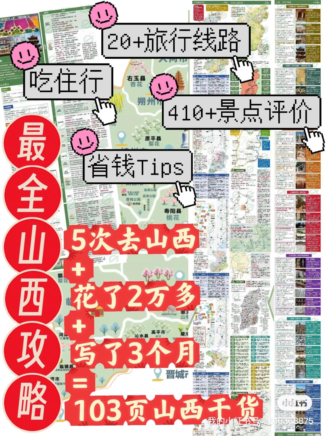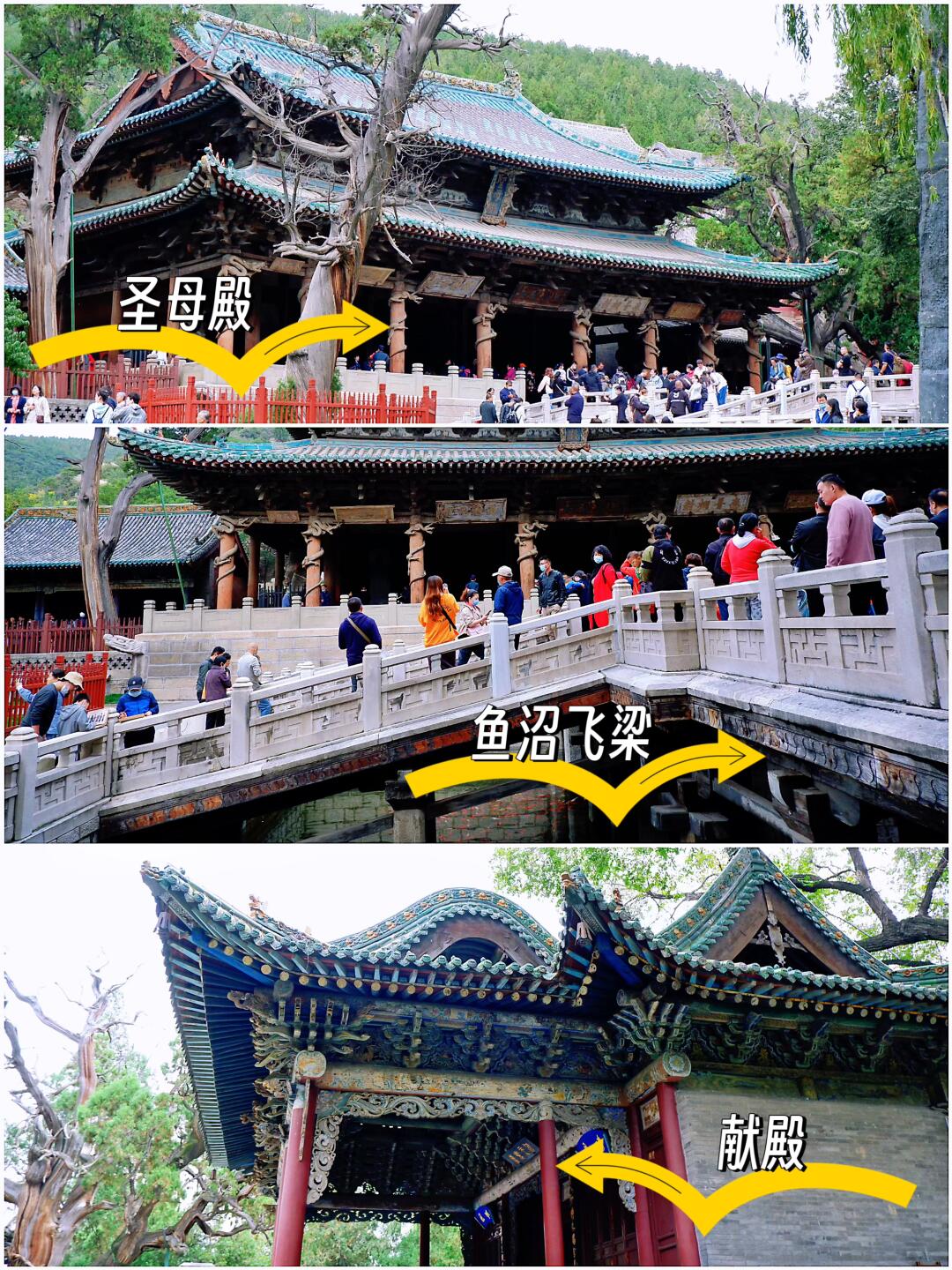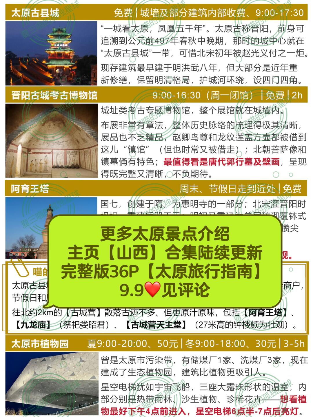 欢迎打开夏三喵的第[九R][七R]篇山西笔记! 完整版106页《山西旅行指南》[向右R]评论自取 —— 如果你想真正感受山西文化、宁愿放弃北齐壁画、青铜馆,也一定要来晋祠! 🔸庞大古建群,山西“万神殿” 晋祠是现存最早的皇家祭祀园林,国内唯一寺庙、宗祠2合1的建筑群,综合价值仅次于应县木塔、佛光寺。 🔹感受活生生的山西史! 古有晋水,战国时修建智伯渠;初名唐叔虞祠,纪念晋国开国诸侯叔虞及其母后邑姜(周武王妻子、姜子牙女儿));北齐高欢父子在这里起楼阁,筑池馆:唐太宗李世民亲撰《晋祠之铭并序》;宋仁宗修建了宏伟壮丽的圣母殿…… [种草R]晋祠三绝 宋代彩塑:圣母殿内共43尊,簪花仕女尤其美 周柏:周初所植,距今逾三千年 难老泉:晋水源头,出自断层岩隙,常年水温17度 [种草R]古建三宝 圣母殿:北宋木构,有现存最早的木质盘龙殿柱 鱼沼飞梁:现存唯一的十字形桥梁,世界上最早的水陆立交桥 献殿:殿、亭相结合,通风性极好,古代冰箱 [种草R]晋祠其它看点 三匾:水镜台、对越、难老 金人台:4个铁人,宋朝的3个千年不锈,民国的反而锈了 唐碑亭:唐太宗行书《晋祠之铭并序》 唐叔虞祠:晋祠由来、唐叔虞本尊的祠堂 台骀庙:祭祀传说中太原的创建者,有史可查最早的张氏祠堂 联游‼️别错过天龙山! 共25窟,东魏至唐,佛像、浮雕、藻井千余尊。 第9窟(漫山阁)高7.55米的弥勒佛和下方的观音、文殊、普贤菩萨最为出色;第8窟莲花顶有环绕飞天,阿难、迦叶雕工不俗;新建的石窟博物馆内有近年迎回的隋代佛头。 —— [打卡R]晋祠+天龙山,不走回头路! 🔸晋祠分三层:70%看点集中在中线、看完至少2小时;中、南、北三条线都走3-5小时;外围是免费的晋祠公园。 🔹晋祠和天龙山联票110、比单买省20元(需在当日14:00点前购买)。 🔸晋祠从东门(迎曦门)进,直接走中线➡️看完核心区域走东园、晋文公艺术博物馆➡️从南门(向曦门)出来就是晋祠P3停车场(有餐饮店),吃完饭坐观光车去天龙山(末班15:30)。 🔹天龙山有上下两个门,上部【龙门】进入,高欢避暑宫➡️东西峰石窟➡️天龙寺➡️国宝馆,这样一路是下山、不累,也不用走回头路。 更多小众旅行地[向右R]