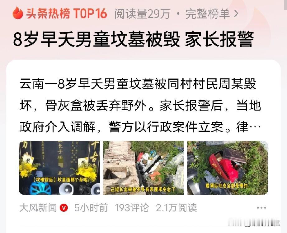 云南大理,男子的8岁儿子意外摔倒死亡,他强忍悲痛,给孩子在国有林地修了坟墓,安葬4个月后,他发现坟墓被毁,儿子的骨灰盒被丢在野地,石板压在儿子的骨灰袋上,男子悲愤万分,想起同村一村民曾警告他迁坟,因为离其祖坟太近了,男子认为林地不是该村民家的,就没同意,没想到遭此横祸。因此,男子报了警,这下闹大了。 2025年9月5日,这天是中元节,杨先生怀着沉重的心情去墓地,想祭奠逝去不久的儿子,到了墓地一看,他直接崩溃了。 眼前的一幕,让他不敢相信自己的眼睛,儿子的坟墓被毁坏,骨灰盒被丢进了离墓地2米左右的野地,石板压在儿子的骨灰袋上…… 杨先生强忍泪水,他急忙去搬开石板,那一刻,他感觉自己很无能,不禁哽咽着红了眼圈,孩子活着的时候没照顾好他,他走了还被人欺负! 原来,2017年杨先生的儿子小杨出生了,他是家里的独苗,一家人视作掌上明珠,可小杨半岁时,被确诊了小脑萎缩,癫痫等疾病。 杨先生一家虽然无可奈何,但还是细心照顾孩子,一转眼,小杨3岁了,残联认定他为一级残疾。 可谁也没想到,2025年4月30号,小杨发生了意外,他摔倒后引发了脑出血,送到医院却没有抢救过来。 杨先生内心充满了自责,对孩子的离去亦是悲痛万分,他说:儿子因为小脑萎缩,经常摔跤。 4月30号下午,杨先生他们把小杨送去火化了。 5月4号,杨先生一家按照当地习俗,给小杨办理了葬礼。 为了能让儿子入土为安,杨先生还问过村干部,给小杨葬在哪里合适? 对方建议他说,离村里3公里左右有一片国有林地,那里比较合适。 之后,杨先生强忍悲痛,给儿子修了一个坟,想给儿子好好安葬,也是为了寄托哀思。 不过,杨先生给儿子修坟时,都是按照规定来的,坟地的面积,墓碑大小都是合规的。 然而4个月后,当杨先生发现儿子的坟墓被毁后,他真的控制不住自己的情绪了。 他想起来,8月初,同村的周某给他打电话,说小杨的坟墓建在了他家祖坟旁边,让他尽快把坟迁走。 杨先生说,两座坟离着能有五六米远,另外,那地是国有林地,如果周某能证明那片林地是他家的,那我就迁坟。 周某却说,那片林地葬了他们周家几位逝者,属于他们家家族祖坟了。 8月11号,村里对杨先生和周家进行了调解。 村干部表示,事发地属于国有林地,如果周家让杨先生迁坟,得拿出依据,可周某的哥哥拿不出来,但是他还是要求杨先生必须迁坟。 调解没成功,村干部告知周家不能毁坟,有诉求就向上面反映。 8月14号,杨先生接到周某电话,说周家族人商量后,让他必须把小杨的坟迁走,不然就去推倒坟墓。 杨先生没想到对方来真的,事后,他从警方了解到,8月15号,儿子小杨的坟墓被周家多人毁坏。 9月5号,杨先生报警。 值得注意的是,此事中,看到一个关键点那就是杨家自己有祖坟用地,但却没有埋在自己的祖坟地里。 据知情人说,当地有小孩不能进祖坟的风俗,所以,小杨没有埋进祖坟可能与这有关。 杨先生解释说,村里的习俗,成婚前去世的人,会葬在村附近的山上。 有人说,就是夭折的孩子不能进祖坟,所以他没把孩子埋进杨家的祖坟,自己家长辈也不会同意的,所以,他就找了一个地方埋,恰好这个地方附近是埋得周家人。 也有人说,再怎么风俗,去扒人家孩子的坟墓,把骨灰都弄出来,抛尸荒野一样意思,这样对他家就好吗? 从法律方面来讲,周某等人将小杨的坟墓破坏,把骨灰盒丢在野地,这种行为明显符合故意破坏他人坟墓、丢弃他人骨灰的情形。 10月3号,警方已以行政案件立案。 根据《治安管理处罚法》第65条规定,第一款:故意破坏、污损他人坟墓或者毁坏、丢弃他人尸骨、骨灰的;处五日以上十日以下拘留;情节严重的,处十日以上十五日以下拘留,可以并处一千元以下罚款。 杨先生因周某等人破坏儿子小杨的坟墓的行为遭受了财产和精神上的双重损失。 从财产方面看,周某等人需恢复坟墓原状,若无法恢复,则要赔偿修坟、重新安置骨灰的实际费用,这是因为他们的毁坏坟墓直接导致了杨先生财产的损失。 在精神层面,坟墓对于杨先生来说是承载对儿子精神上的重要寄托,周某等人的行为给杨先生造成了严重精神损害。 所以,杨先生有权要求他们书面公开赔礼道歉,并且可以要求周家赔偿精神抚慰金。 另外,周家认为他们先埋祖坟,就不让小杨在那立坟,没有法律依据。 周家和小杨埋坟的林地属于国有林地,所有权归国家所有,并非周某家族私有。 周某等人认为他们的祖坟葬在林地,就拥有独占使用权,这种说法没有法律依据。 这起毁坟事件令人痛心,希望周家能正视自身错误,积极承担责任,也希望杨先生能早日走出伤痛。乡村邻里更应以此为鉴,遇事依法依规解决,不能随意“动武”,否则要承担法律后果。 关注@福康说法 从日常点滴学法律,生活安稳更有底