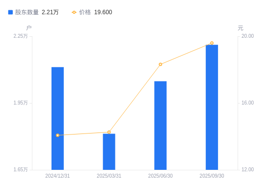 日期A股户数(户)流通A股户均持股数(股)户均持股市值(万元)2025-09-30221198863.5517.372025-06-30204839571.4917.532025-03-311811910820.2915.432024-12-31211179284.1213.062024-09-30217209026.3711.912024-06-30463994225.376.072024-03-31202669673.9812.952023-12-31202679673.5014.662023-09-301452213500.4018.482023-06-301549512652.6519.13