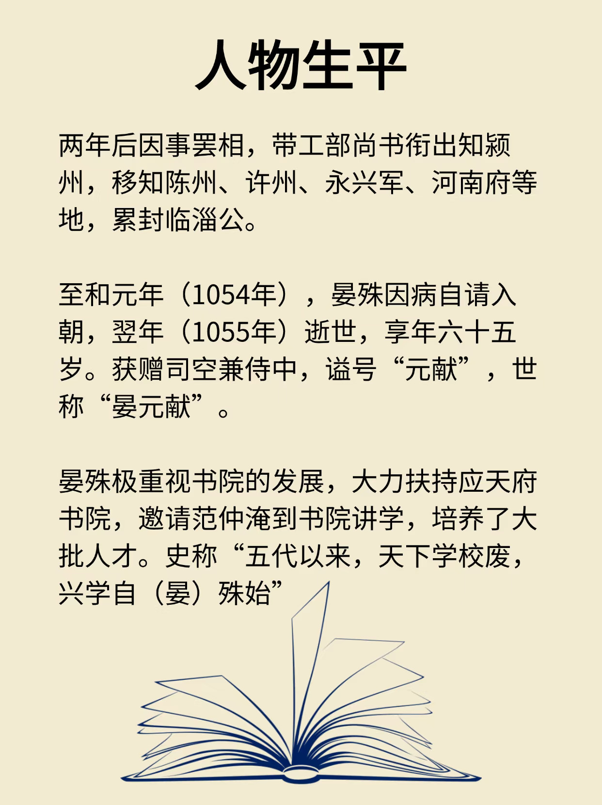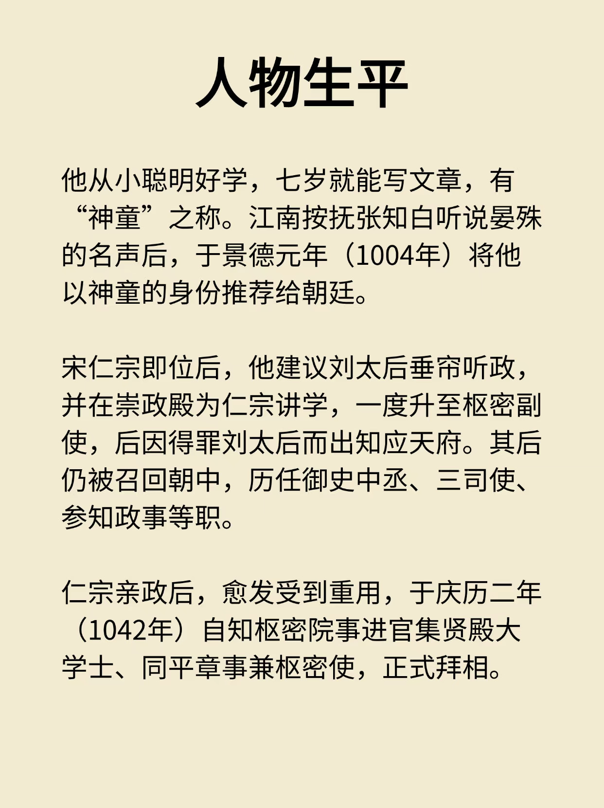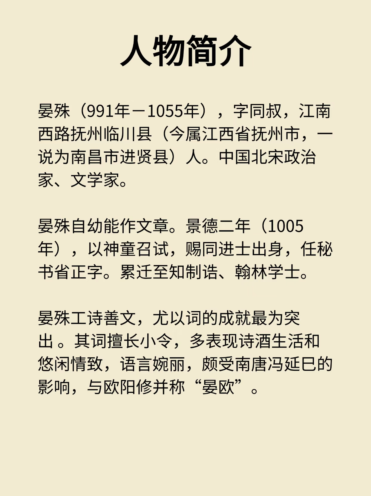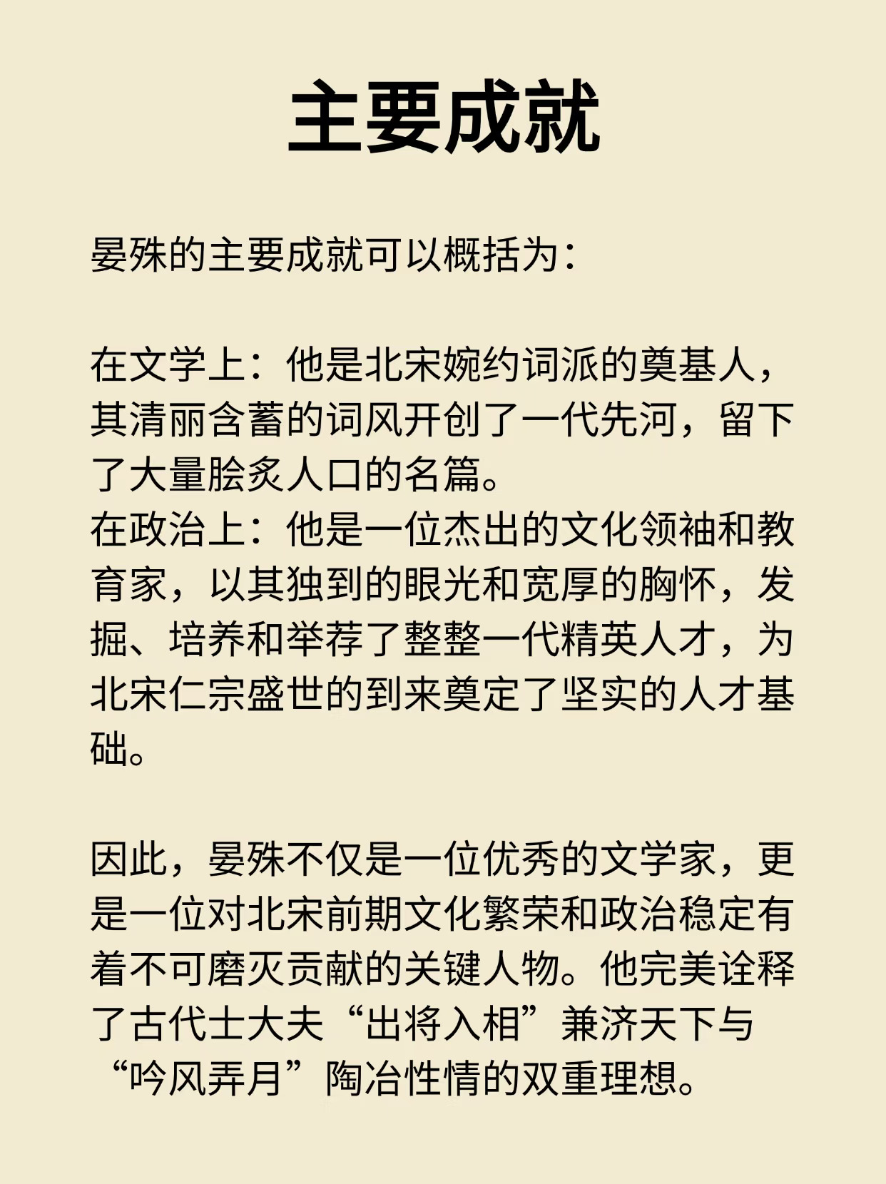 [拔草R]晏殊(991年-1055年),字同叔,江南西路抚州临川县(今属江西省抚州市,一说为南昌市进贤县)人。中国北宋政治家、文学家。 晏殊自幼能作文章。景德二年(1005年),以神童召试,赐同进士出身,任秘书省正字。累迁至知制诰、翰林学士。 [气球R]晏殊工诗善文,尤以词的成就最为突出。其词擅长小令,多表现诗酒生活和悠闲情致,语言婉丽,颇受南唐冯延巳的影响,与欧阳修并称“晏欧”。 [种草R]晏殊的主要成就可以概括为: 在文学上:他是北宋婉约词派的奠基人,其清丽含蓄的词风开创了一代先河,留下了大量脍炙人口的名篇。 在政治上:他是一位杰出的文化领袖和教育家,以其独到的眼光和宽厚的胸怀,发掘、培养和举荐了整整一代精英人才,为北宋仁宗盛世的到来奠定了坚实的人才基础。 [向右R]因此,晏殊不仅是一位优秀的文学家,更是一位对北宋前期文化繁荣和政治稳定有着不可磨灭贡献的关键人物。他完美诠释了古代士大夫“出将入相”兼济天下与“吟风弄月”陶冶性情的双重理想。