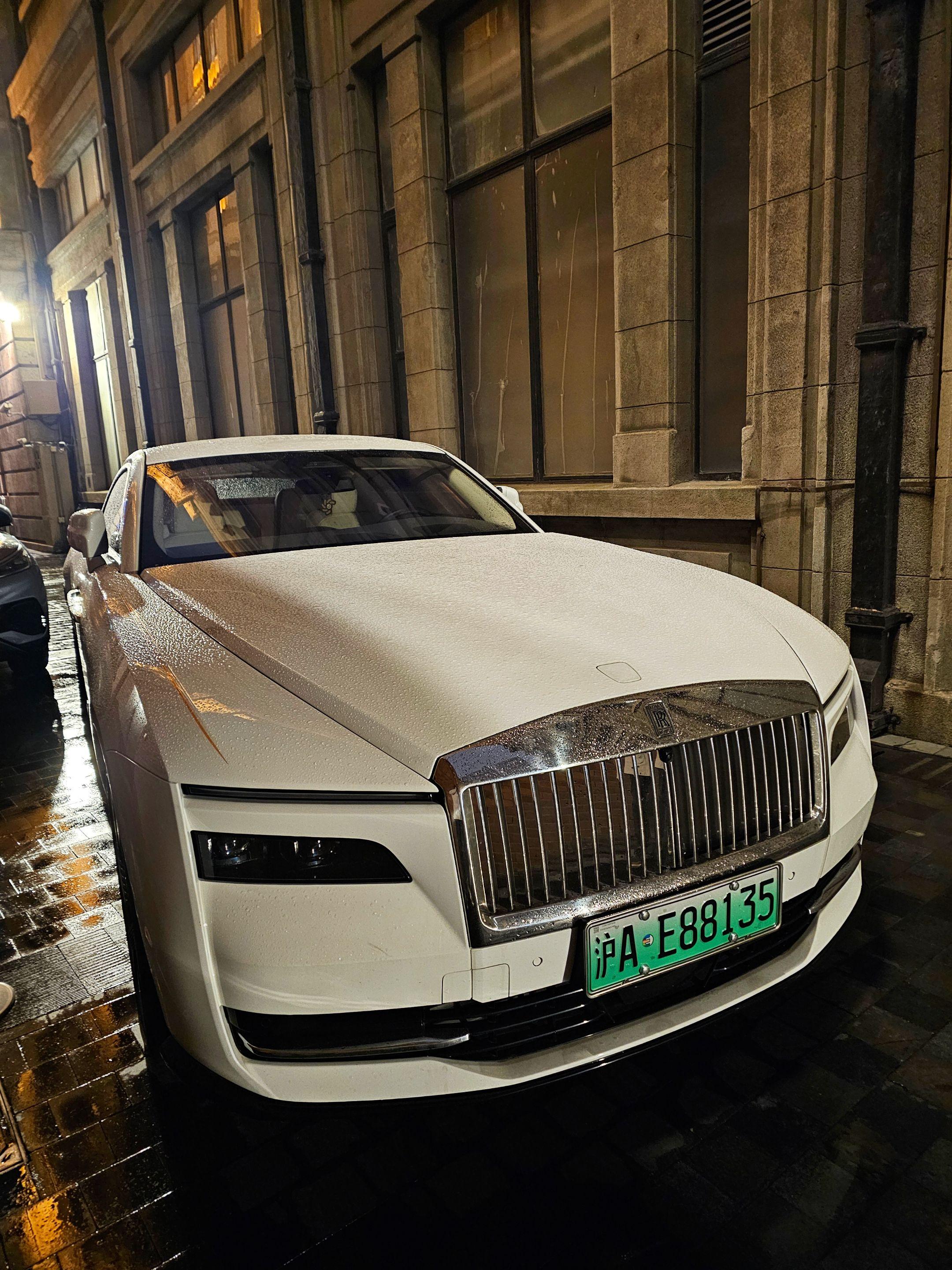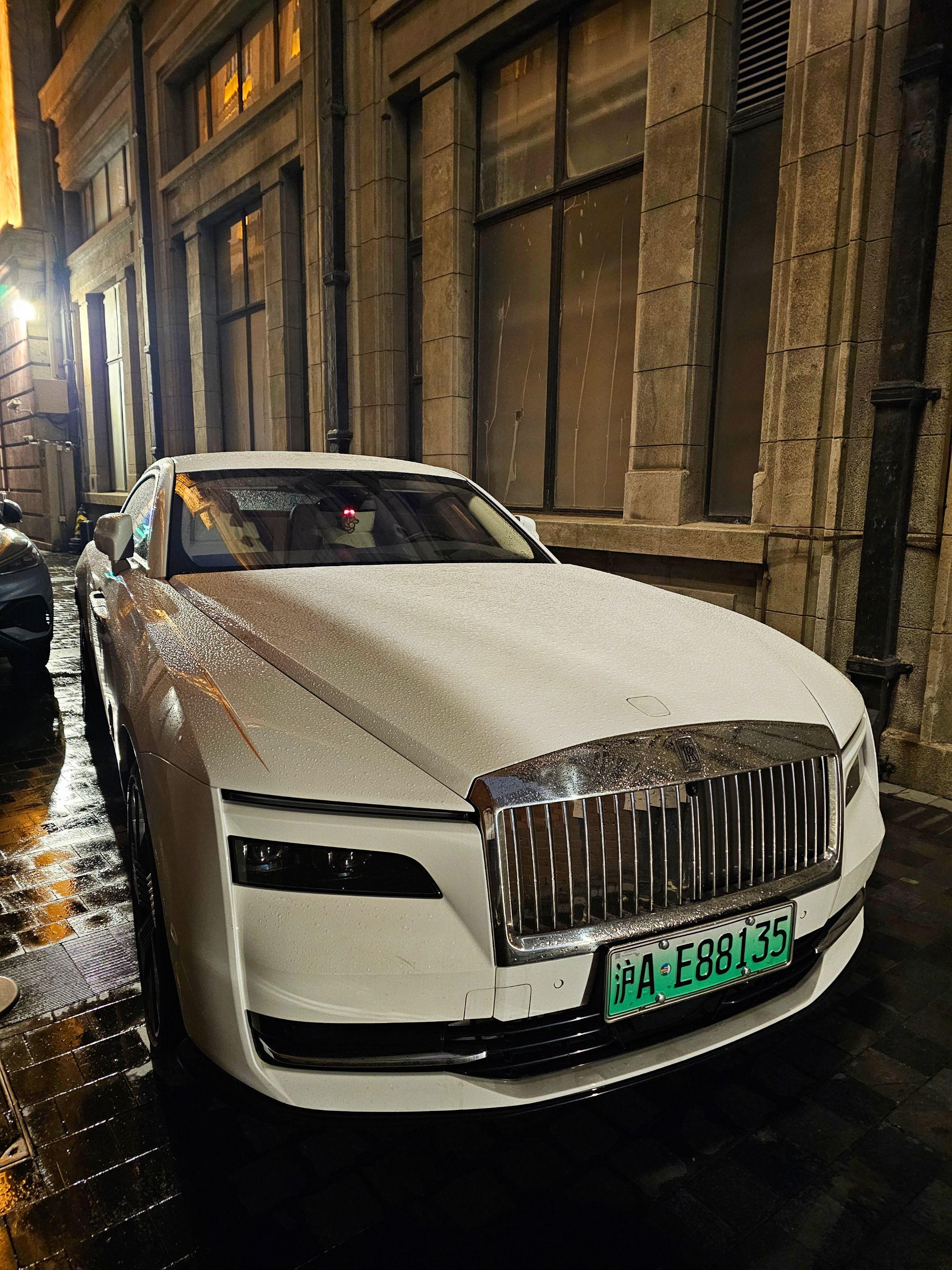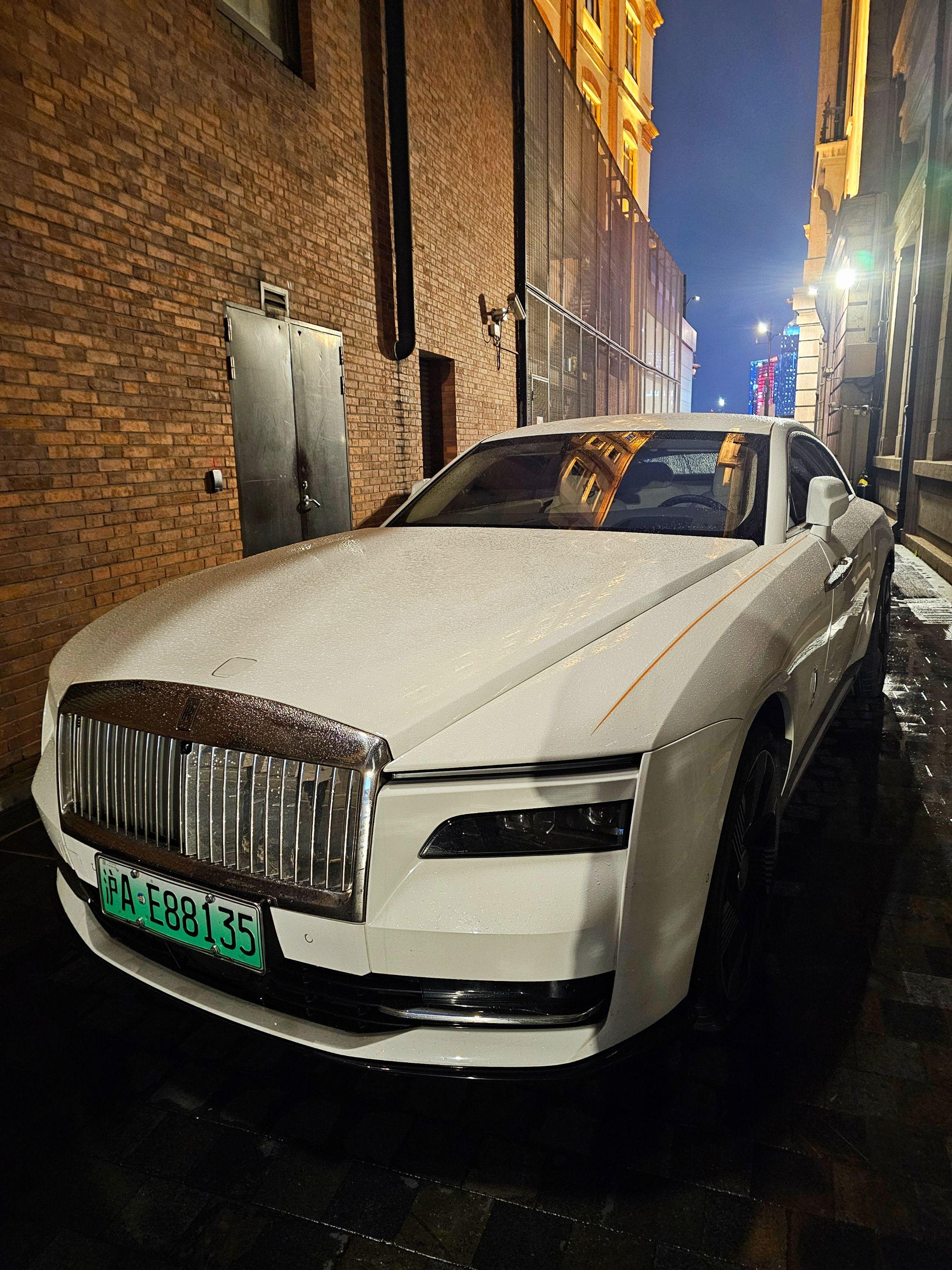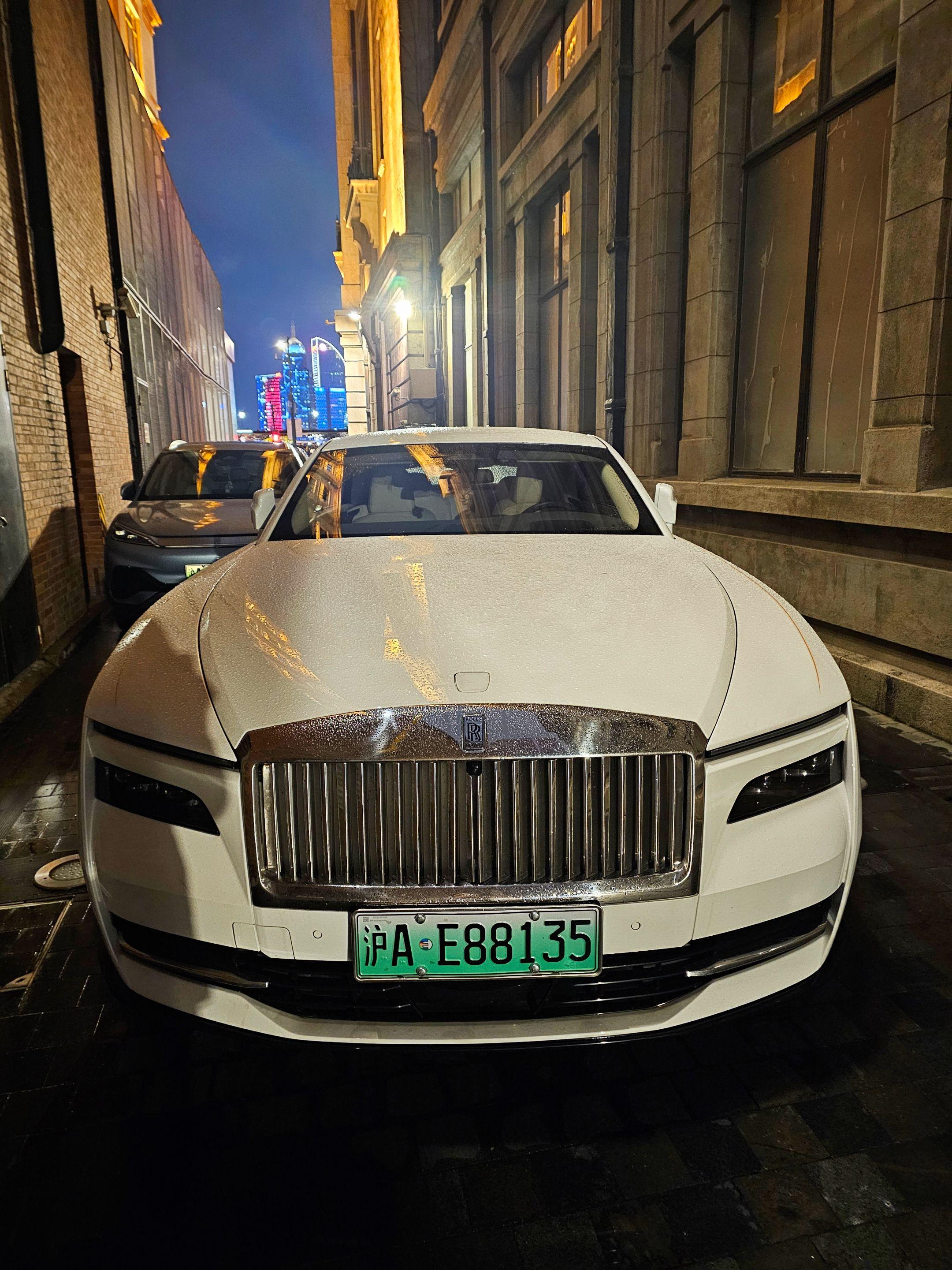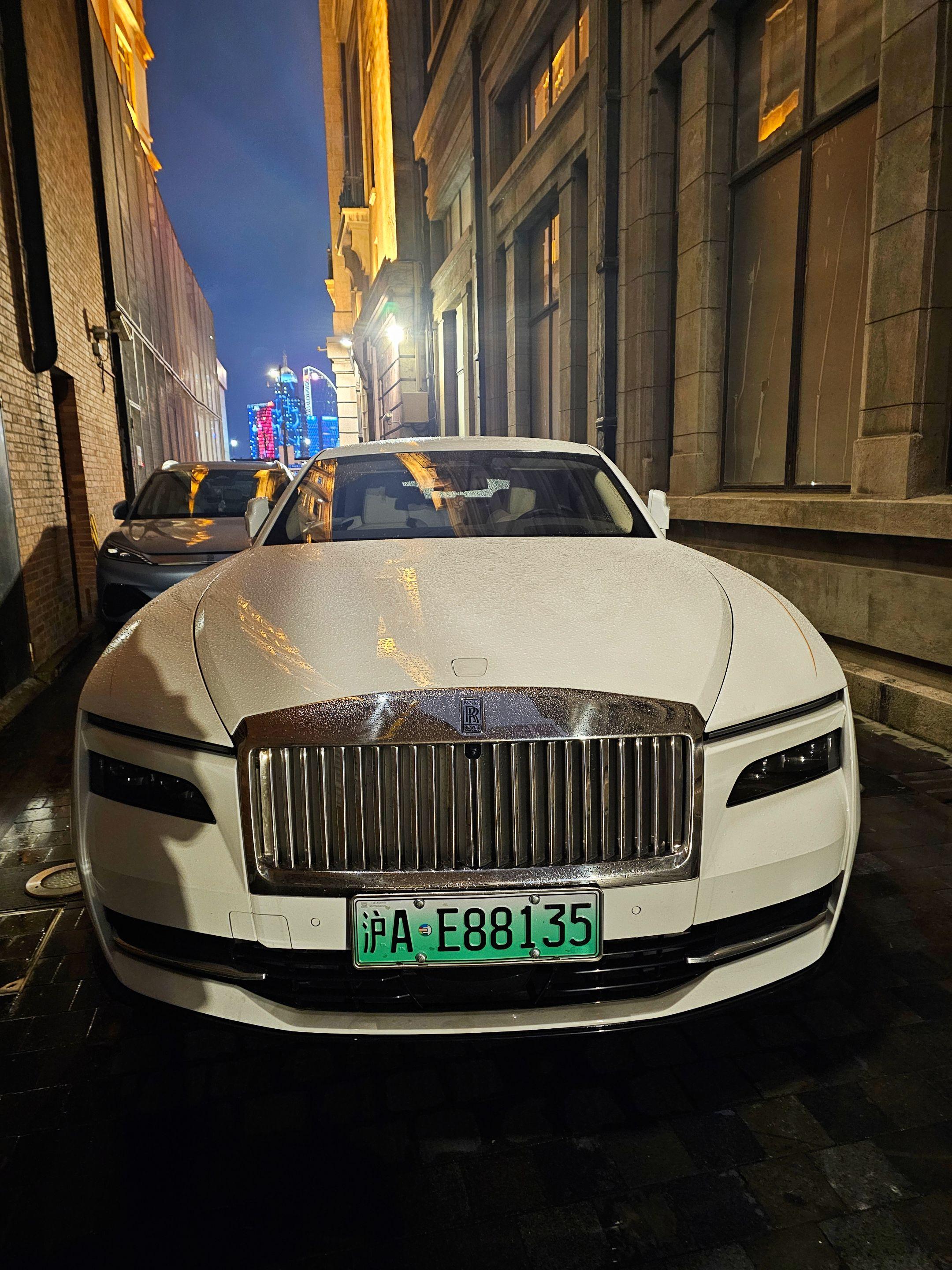 上海外滩偶遇地表最贵的电车劳斯莱斯闪灵,纯白色的外观和金色腰线23寸锻造轮毂真的太有韵味太好看了,买它的人也不在乎是不是绿牌了!