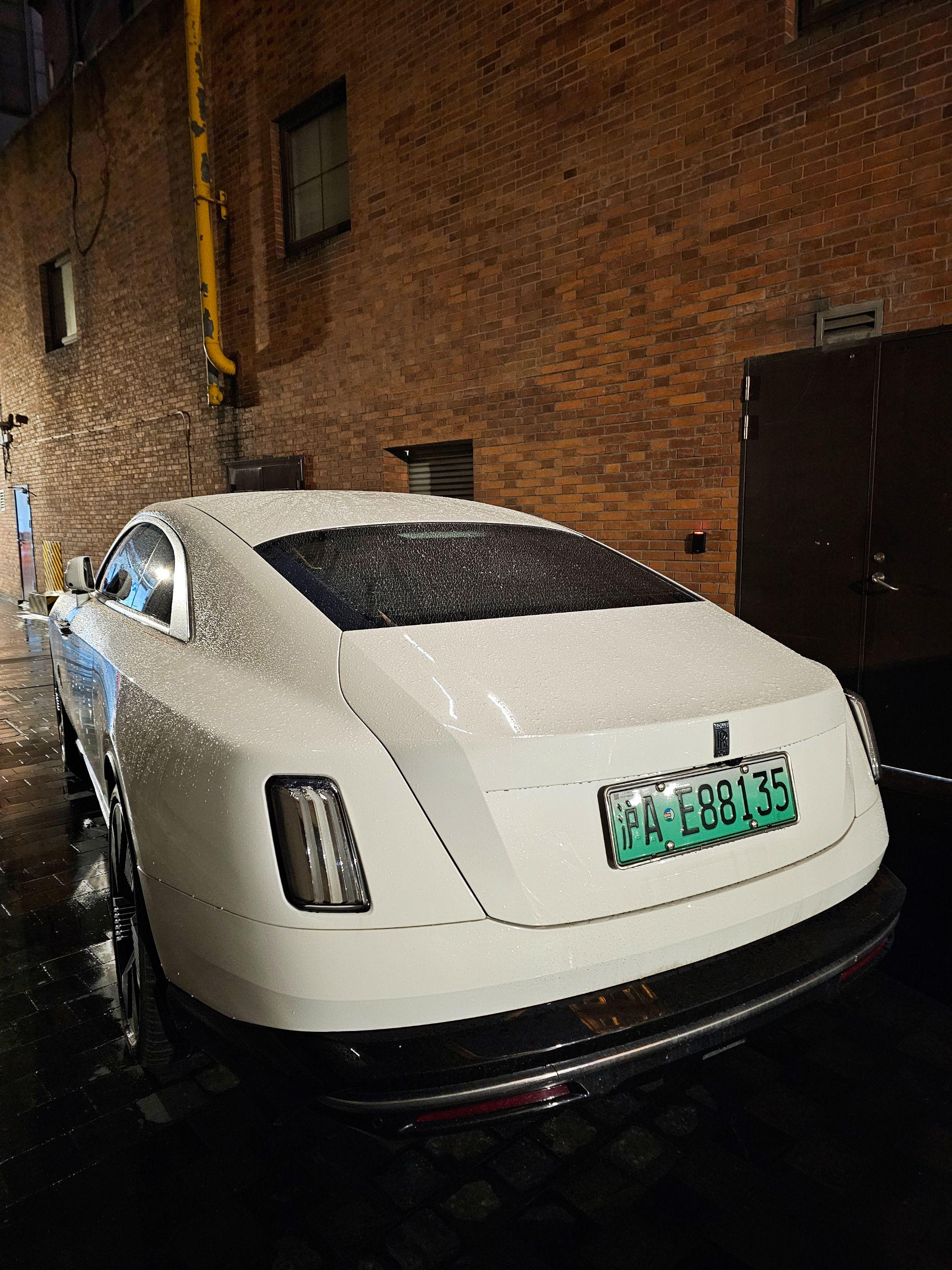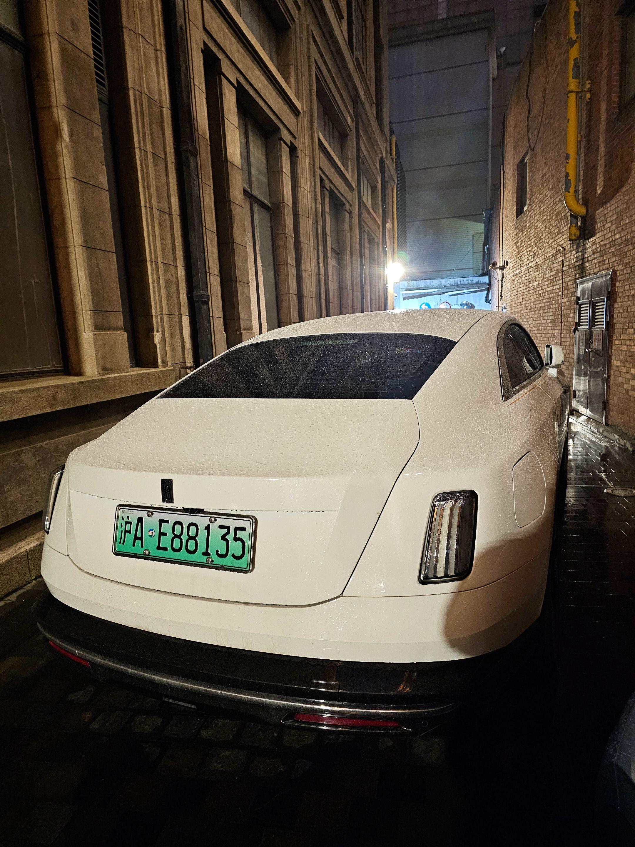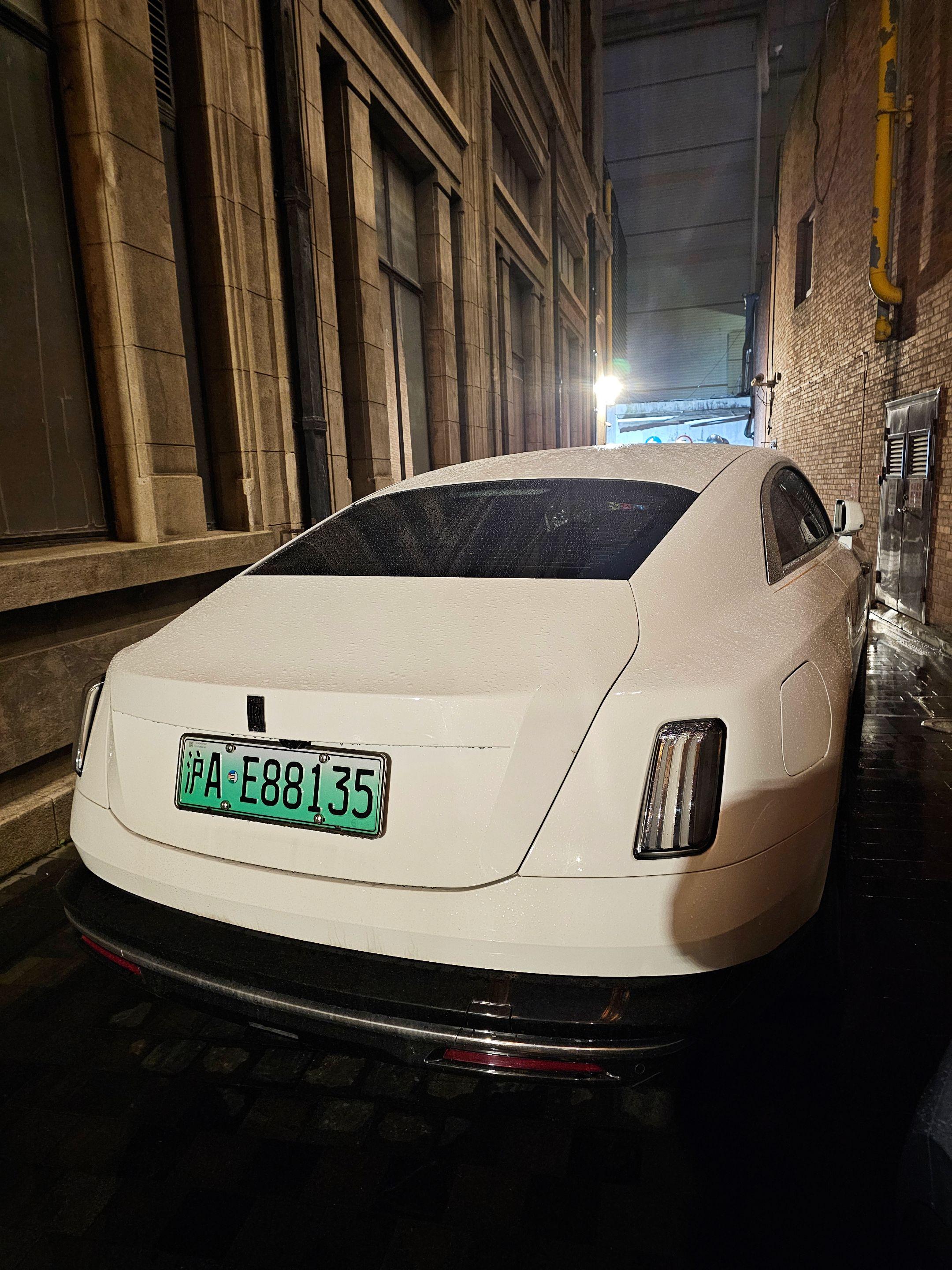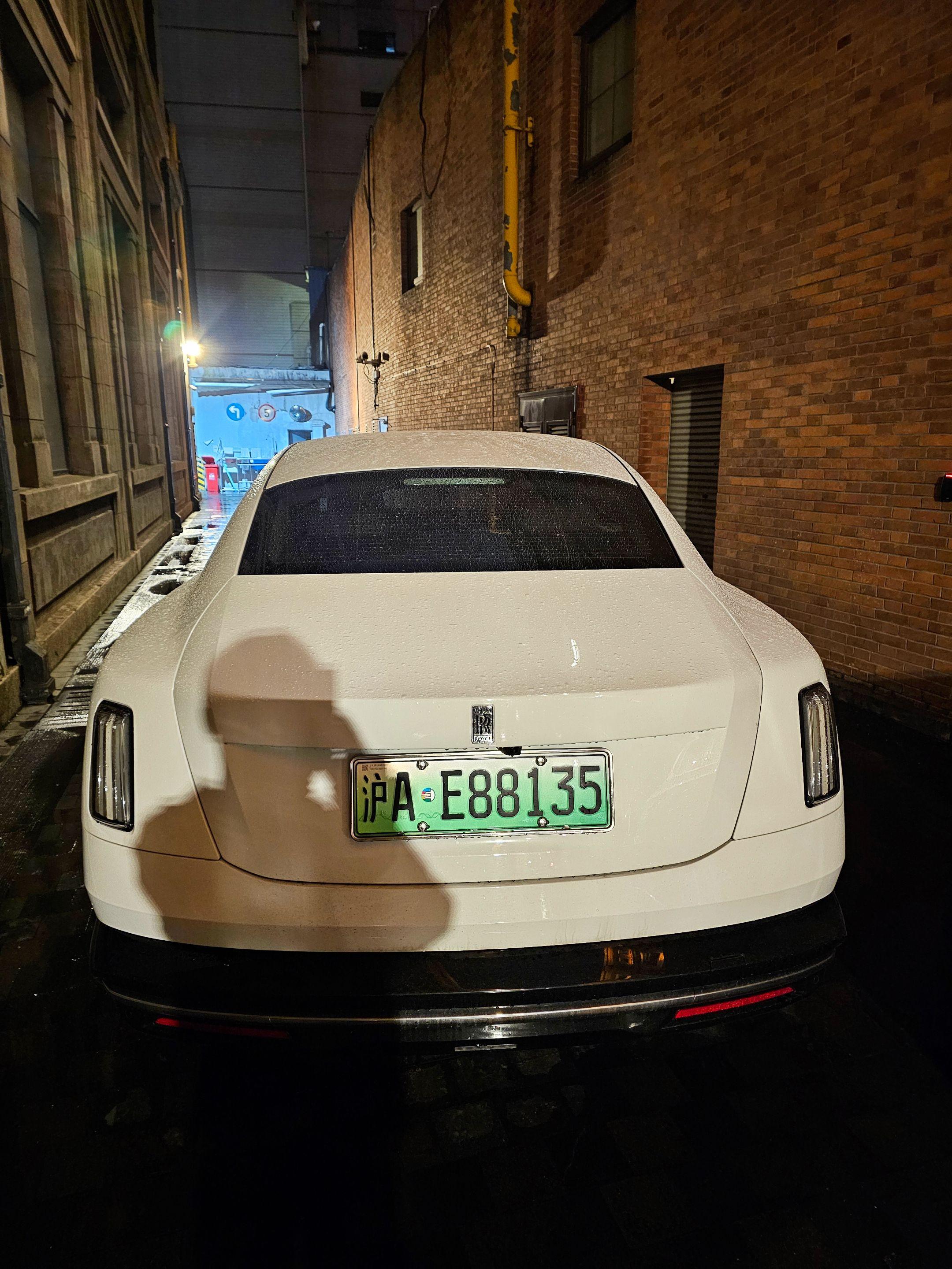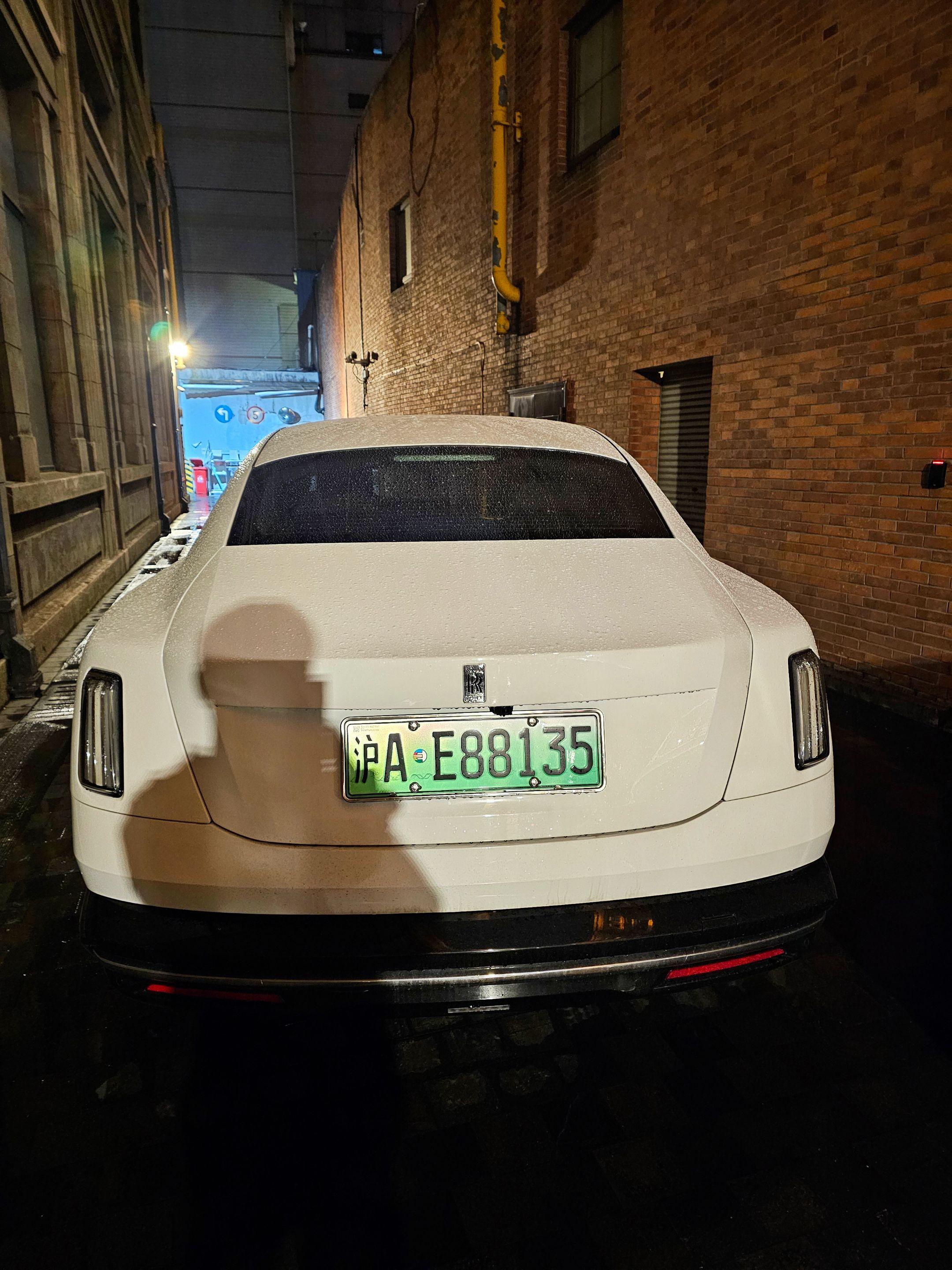 上海外滩偶遇地表最贵的电车劳斯莱斯闪灵,纯白色的外观和金色腰线23寸锻造轮毂真的太有韵味太好看了,买它的人也不在乎是不是绿牌了!