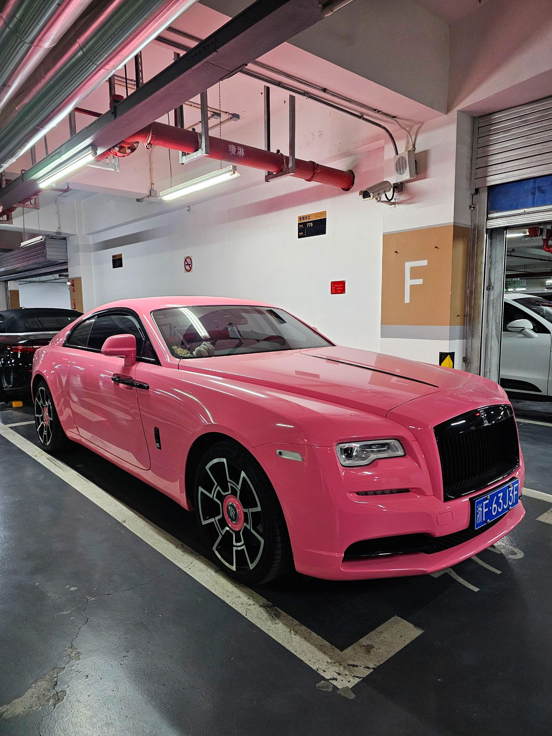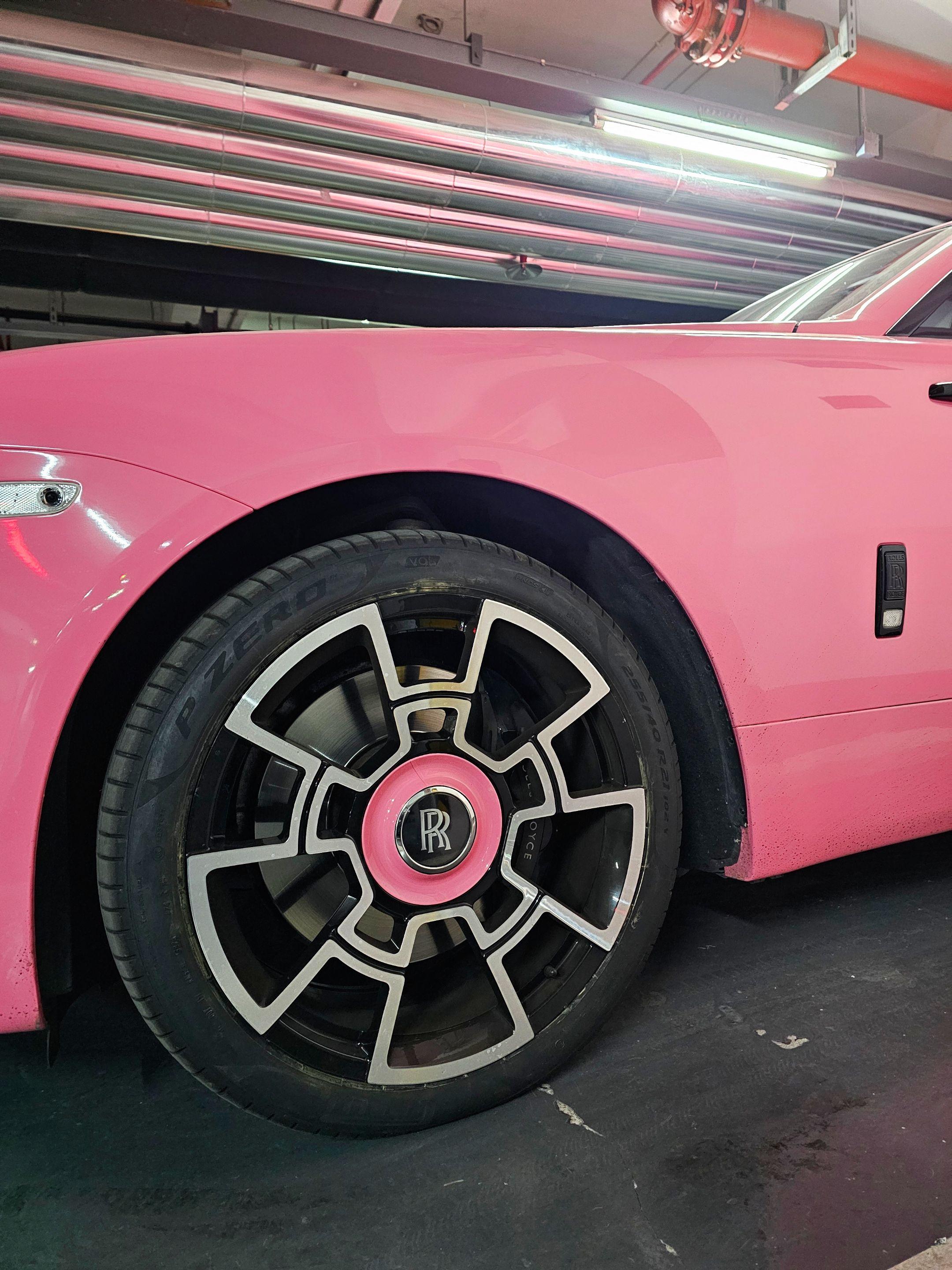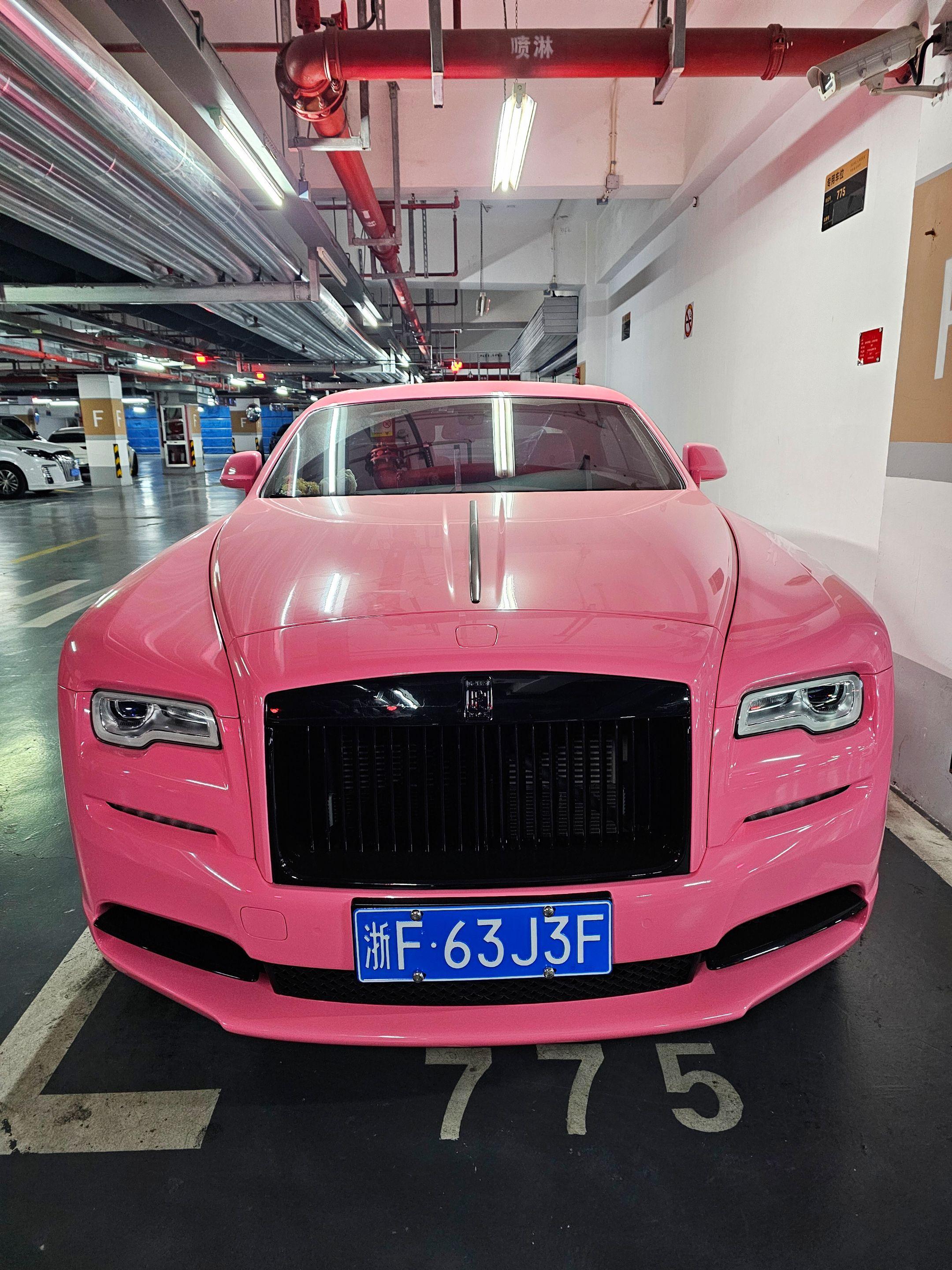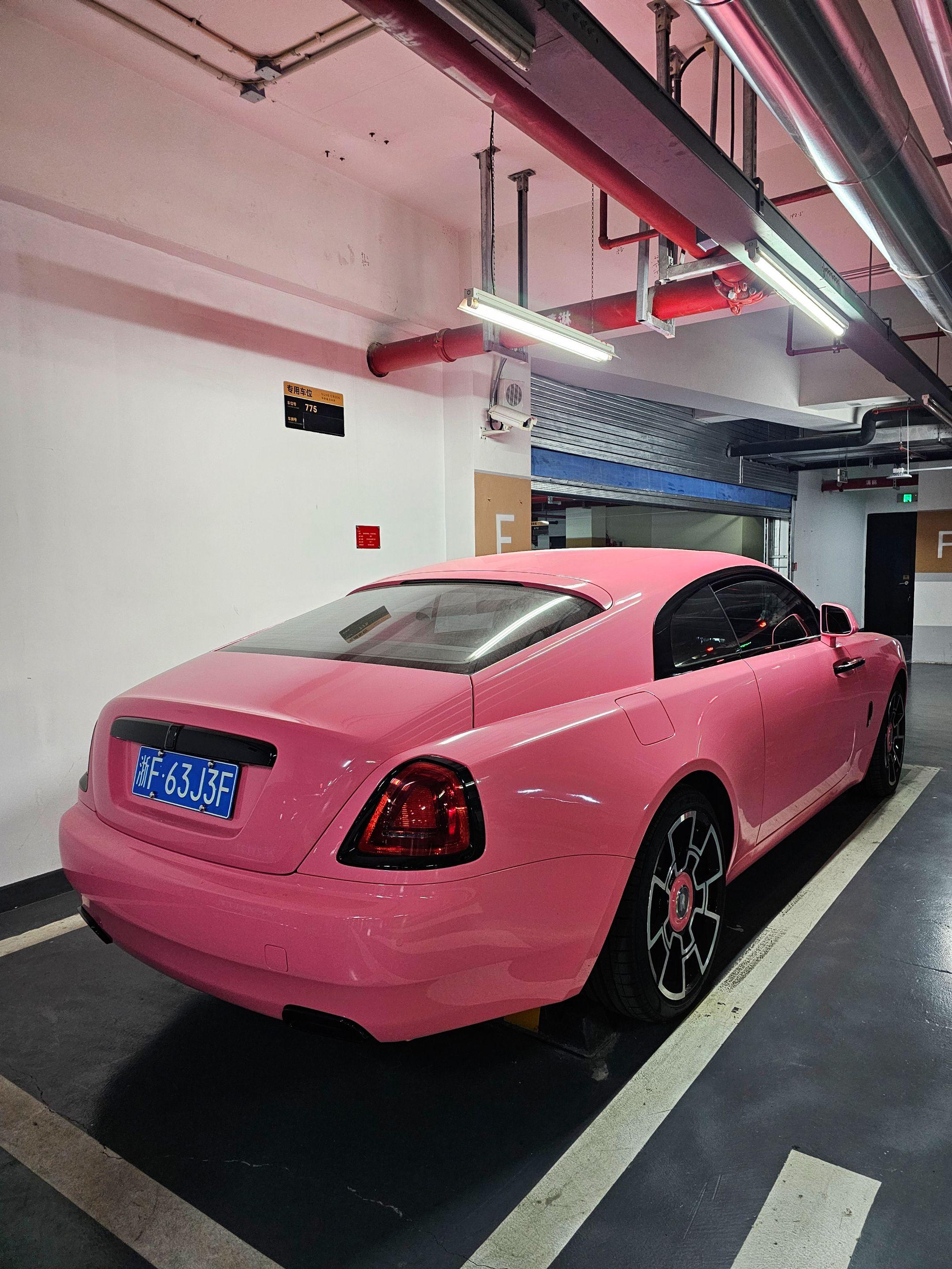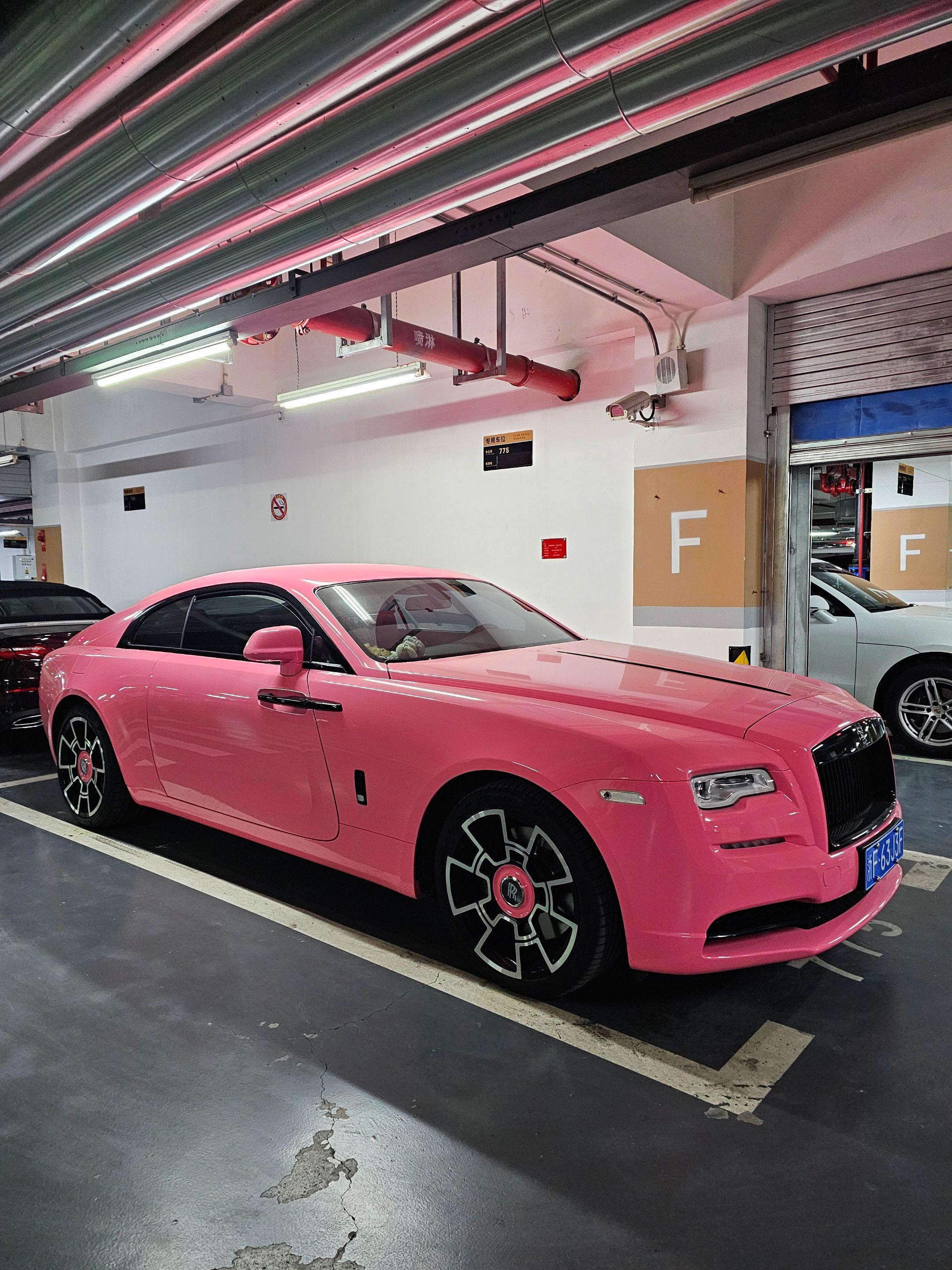上海某地库偶遇小姐姐的劳斯莱斯魅影Black Badge 粉色外观粉色内饰和原厂黑色套件中网帕特农神庙碳钎维的轮毂,实车看到优雅奢华