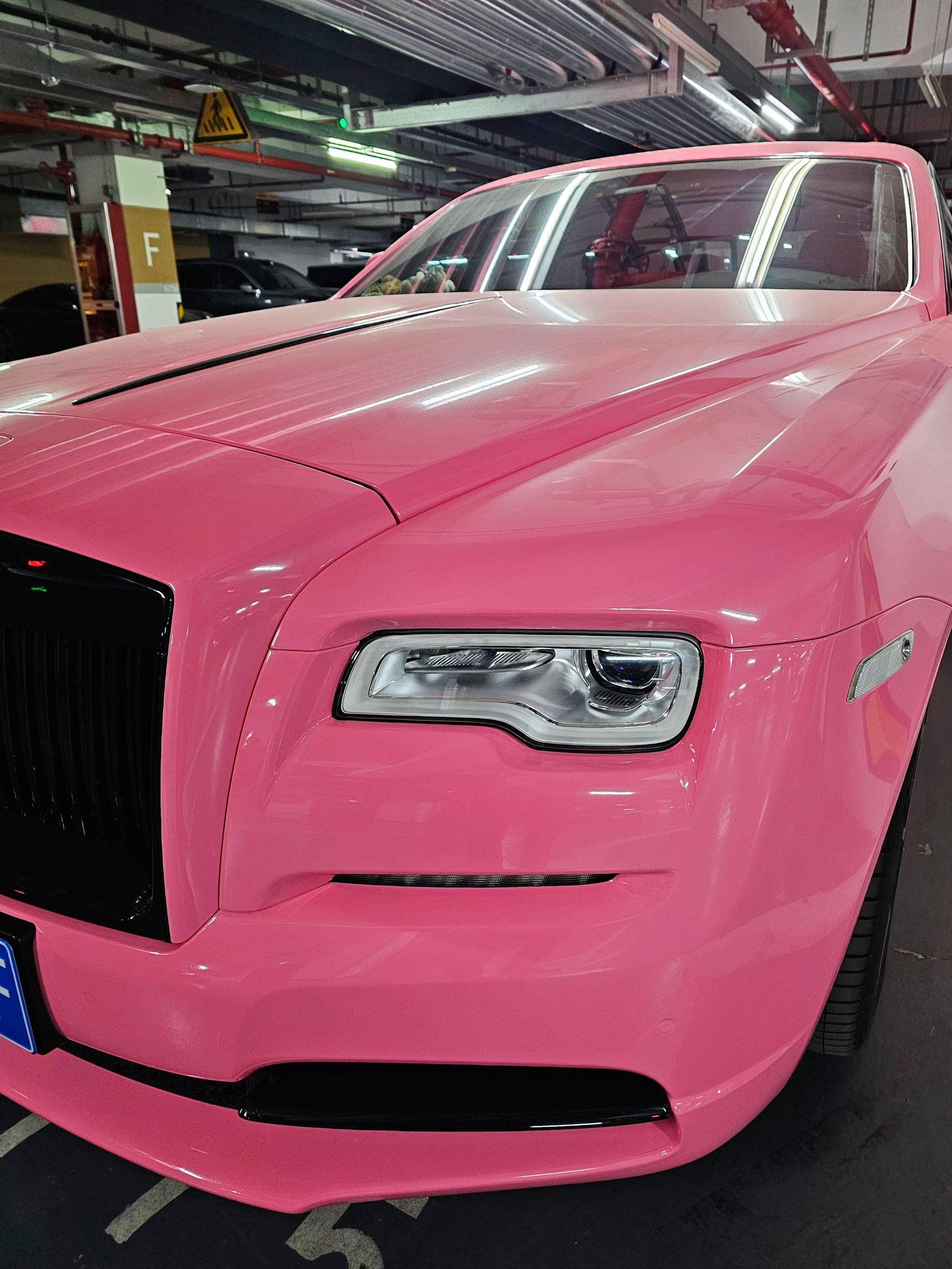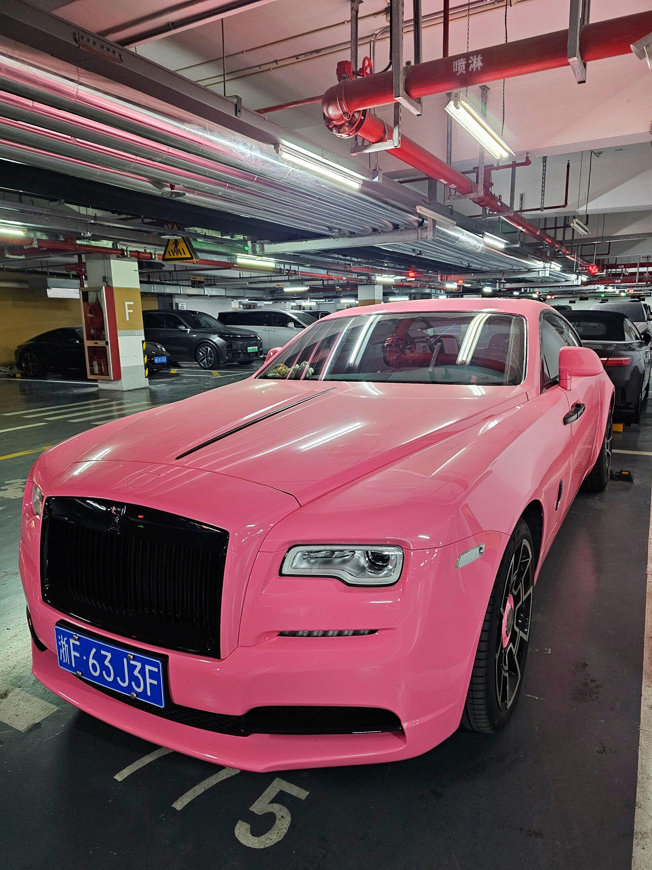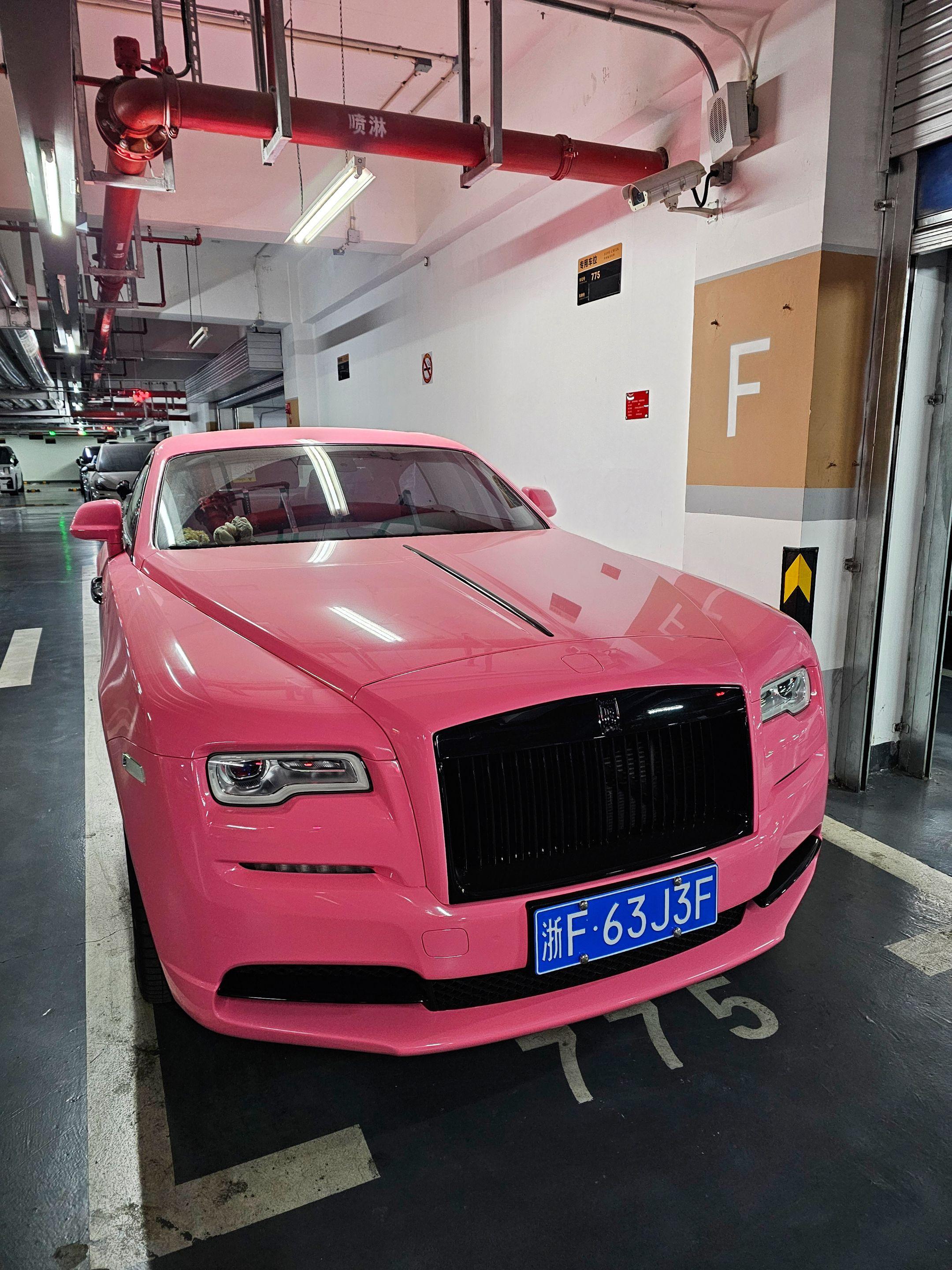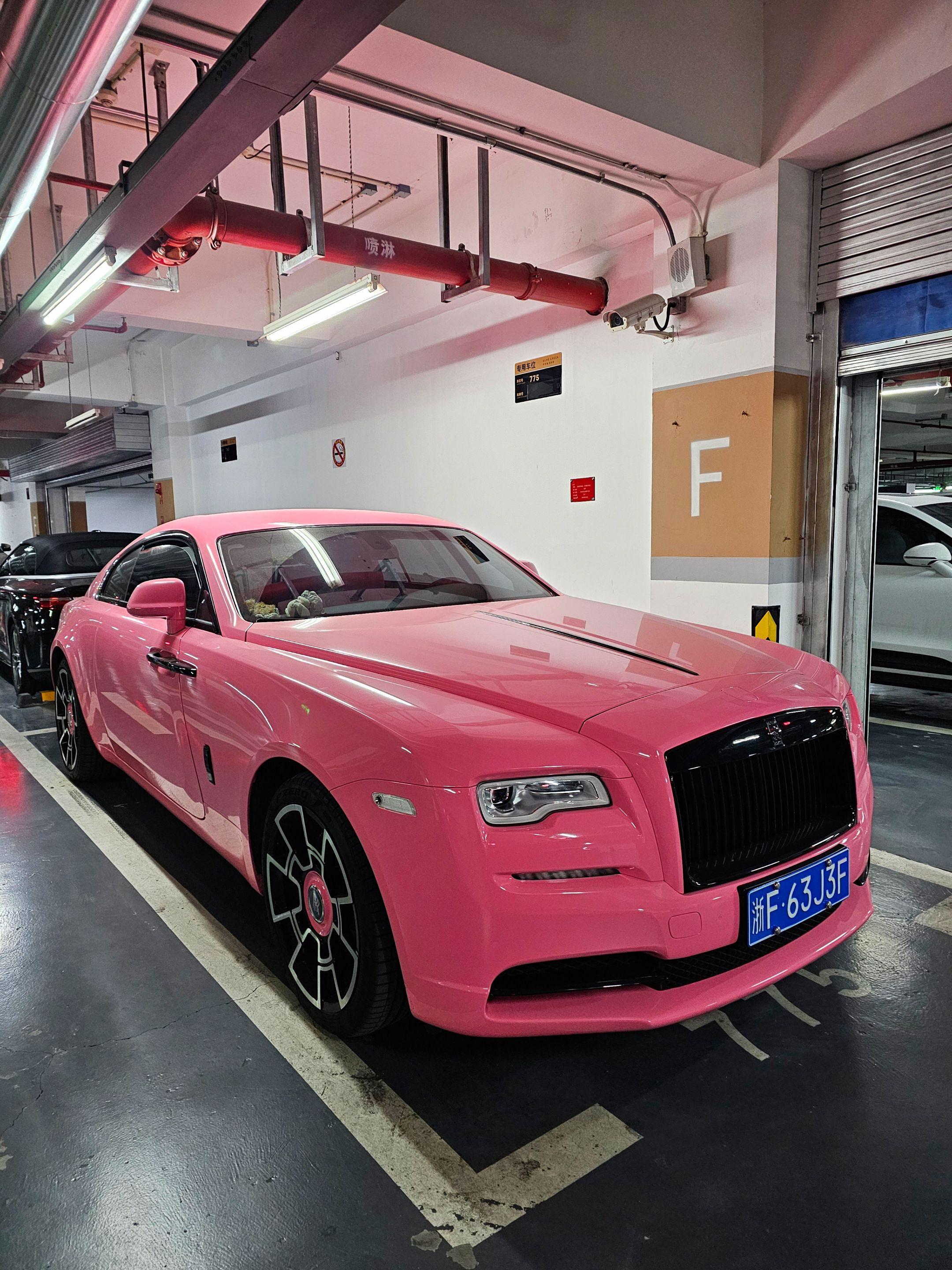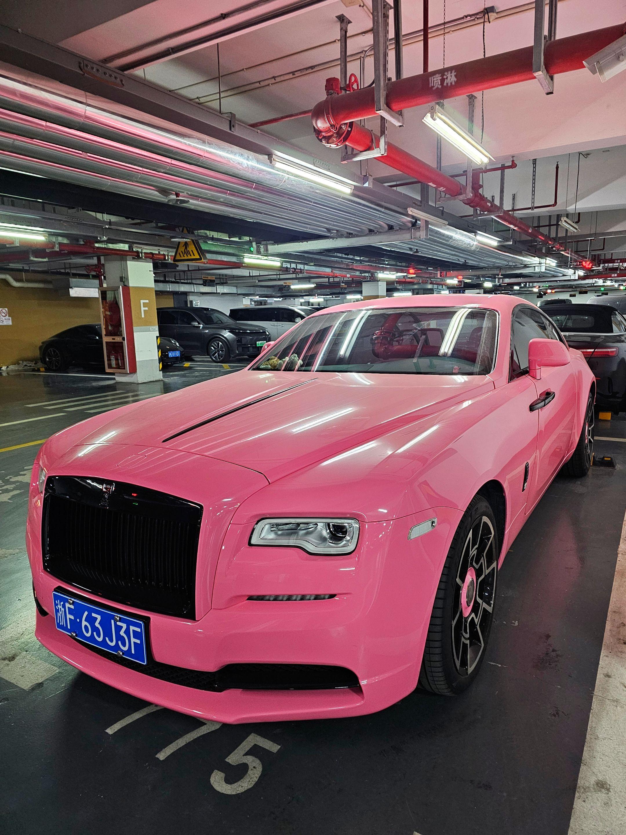 上海某地库偶遇小姐姐的劳斯莱斯魅影Black Badge 粉色外观粉色内饰和原厂黑色套件中网帕特农神庙碳钎维的轮毂,实车看到优雅奢华