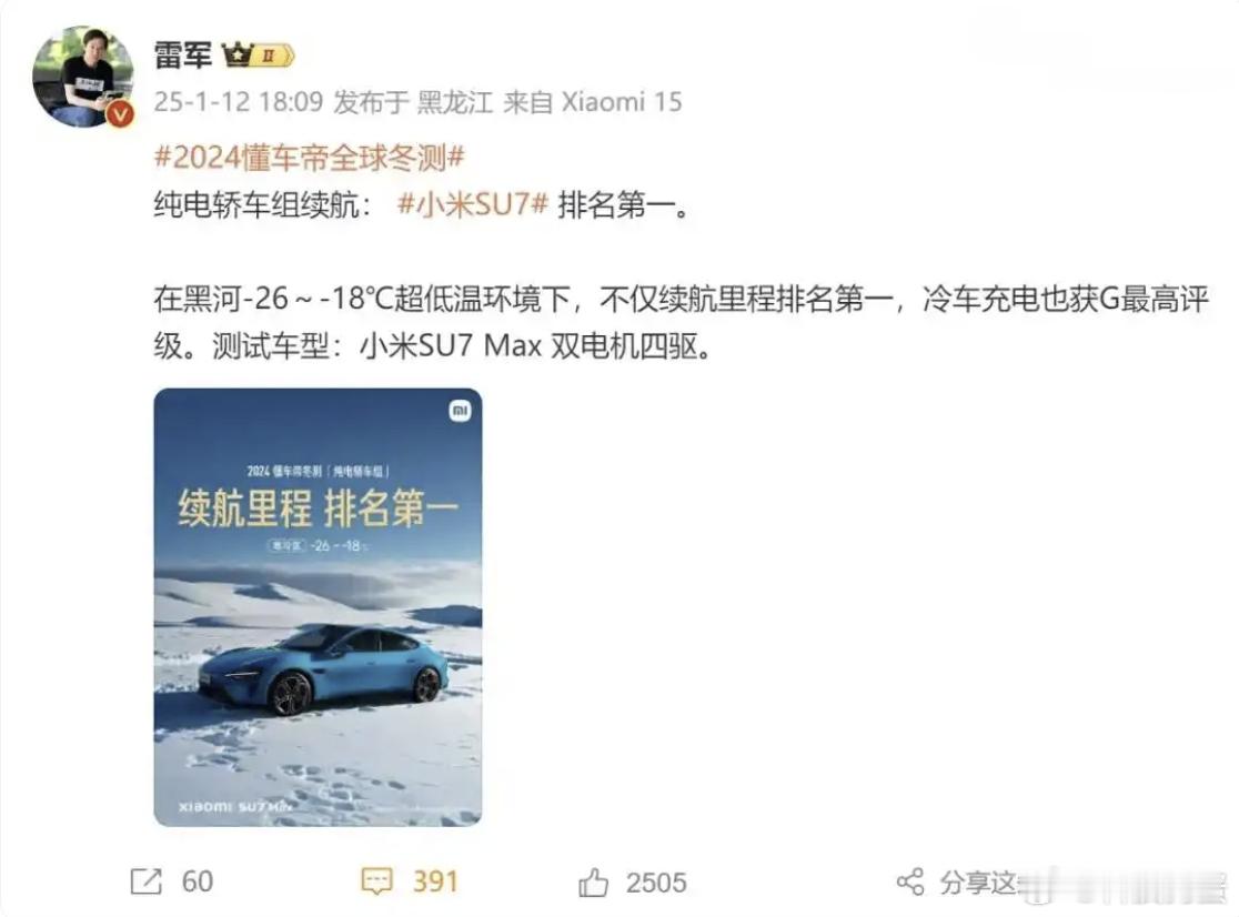 再说了,小米自家测试早就在黑河极寒环境下做过了。媒体从用户视角出发,做一个更贴近多数人用车场景的准冬季测试,有什么问题?去年各大平台的冬测,小米SU7都是续航第一,今天YU7刚来个开胃小菜拿个第一,怎么就坐不住了?淡定,测试还长着呢。