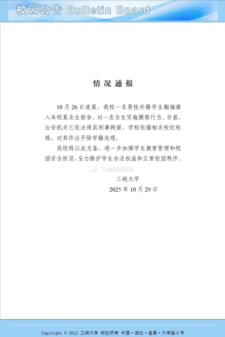 三峡大学通报留学生夜闯女寝三峡大学的事情昨天刷到了,说是有黑人留学生凌晨两点徒手