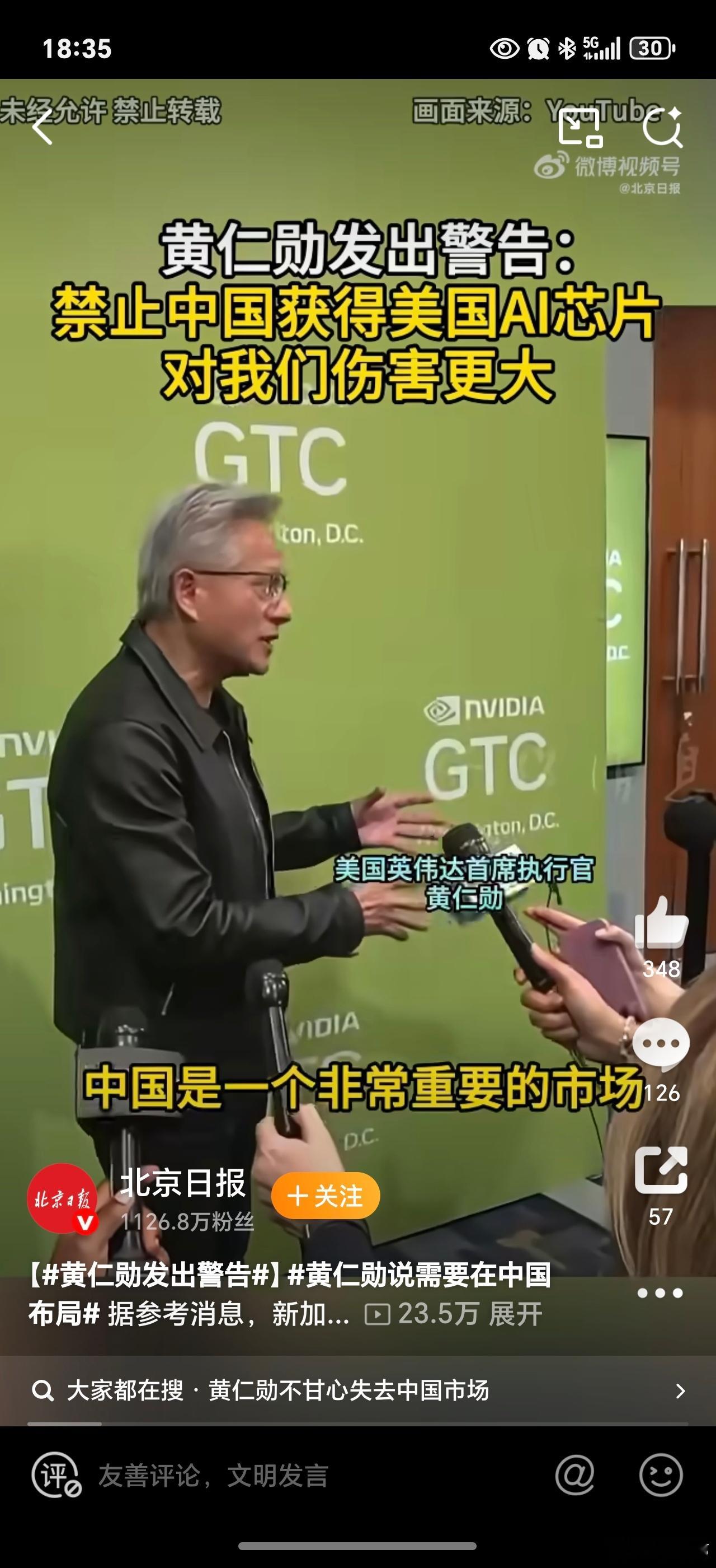 黄仁勋发出警告黄仁勋确实很精明,因美国持续加码的AI芯片出口管制,英伟达在中国高端AI芯片市场的份额已从95%暴跌至0%;
