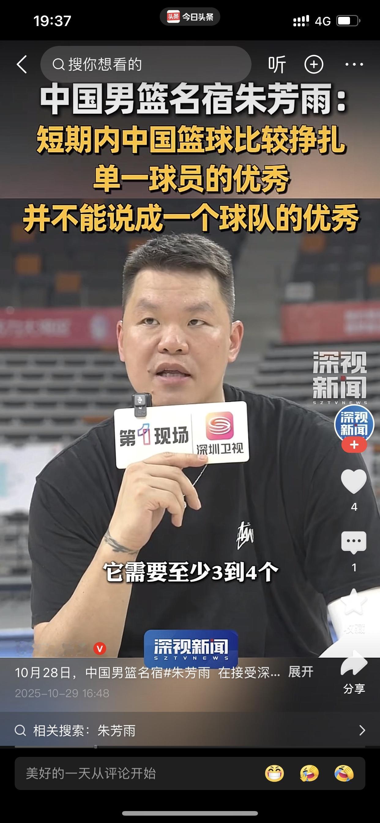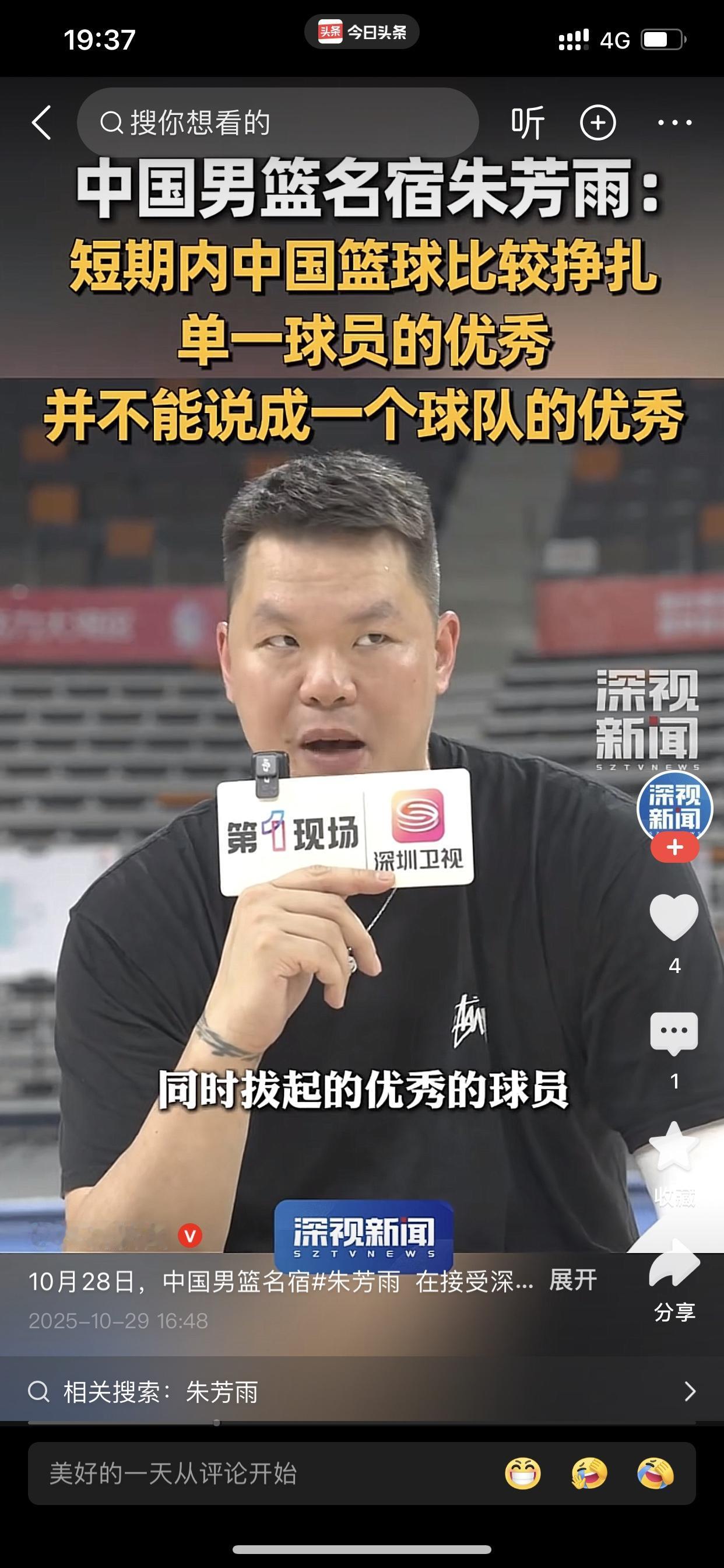 朱芳雨说:短期内中国篮球会处于挣扎的困境! 然后他说一个球队不是一个拔尖球员就