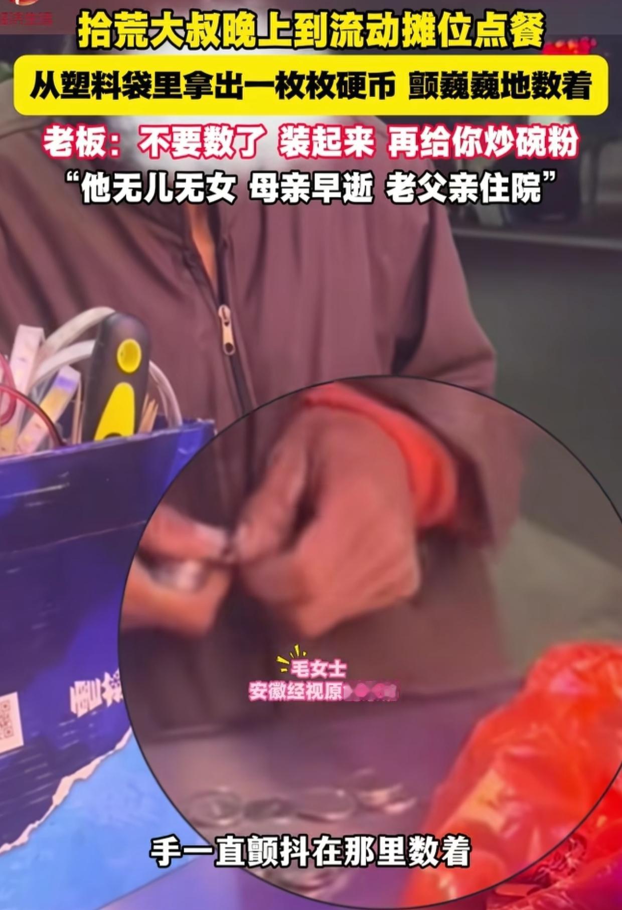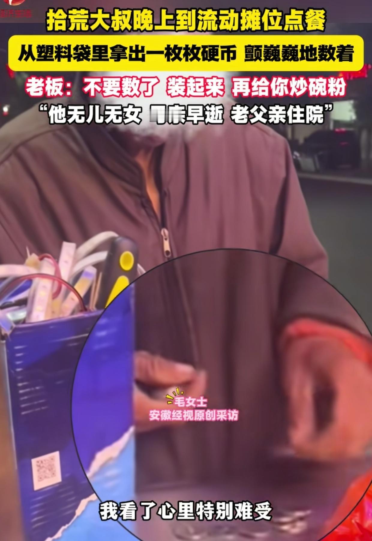 江西,女子的小吃摊来了位拾荒老人,点了30元食物,女子给优惠到25元。谁知老人付钱的时候,善良的女子瞬间破防了! 当时老人是拿出了一个塑料袋付钱的,里面都是一枚枚的硬币。老人颤巍巍数着,认真地将一元一元的硬币挨个放到摊位的铁板上。 女子看到老人单薄破旧的衣衫,数钱时颤抖的手,想到这些硬币都是老人捡废品一点一点挣来的,心里说不出的难受,瞬间破防了。 女子拦住老人说:“不要数了,把钱收起来吧,你晚上没吃,我再帮你多做一碗炒粉!”老人不好意思不付钱,可女子再三坚持让老人把钱收了回去。 接下来女子和老人聊天,这才了解到,老人无儿无女,老母亲早已去世,现在只有一个老父亲正在住院。 老人凄苦的身世让女子唏嘘不已,她为能帮到这样一个不幸的人感到欣慰,回家后特意分享了这个视频。 看到视频,很多网友为女子点赞,称赞女子人美心善,祝愿她好人一生平安。 但也有网友说,善事做了就做了,没有必要发出来吧!有点儿质疑女子的意思。 我觉得女子不应该被质疑。 赠人玫瑰,手有余香,善良的人以助人为乐。女子只是因为自己帮助了老人感到高兴,和分享其他快乐一样把这件事分享给了大家。 但行好事,莫问前程。女子真心地同情和帮助了老人,她的善良不会因为发布了这个视频而削弱。 生活中,越是善和美的事物越需要分享,越是正能量越应该传播!