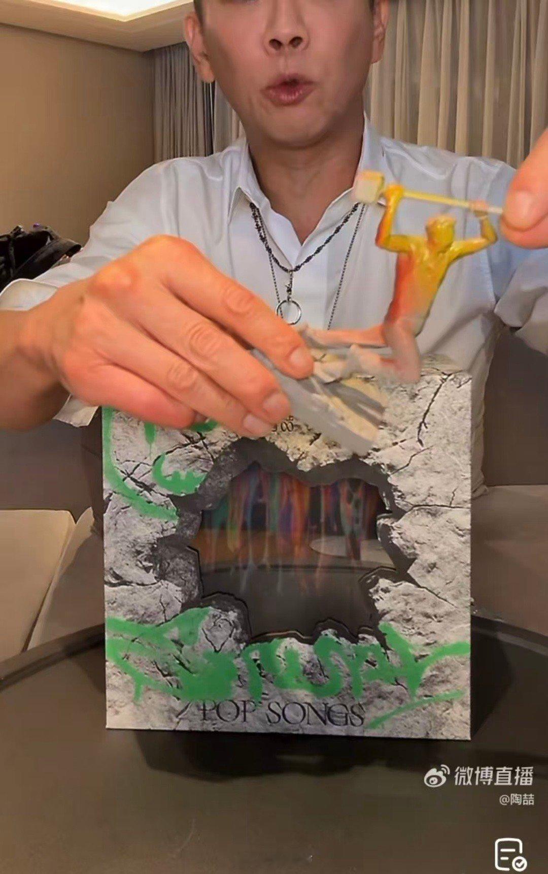 陶喆直播开箱实体专辑 谁看了今晚的开箱直播不笑啊!拆到自己喷的“番茄炒蛋色”公仔时超得意,转头用大铁片刮歌词本刮乐,刮半天没刮开还吐槽“这铁片也太硬了”,反差萌直接拉满。