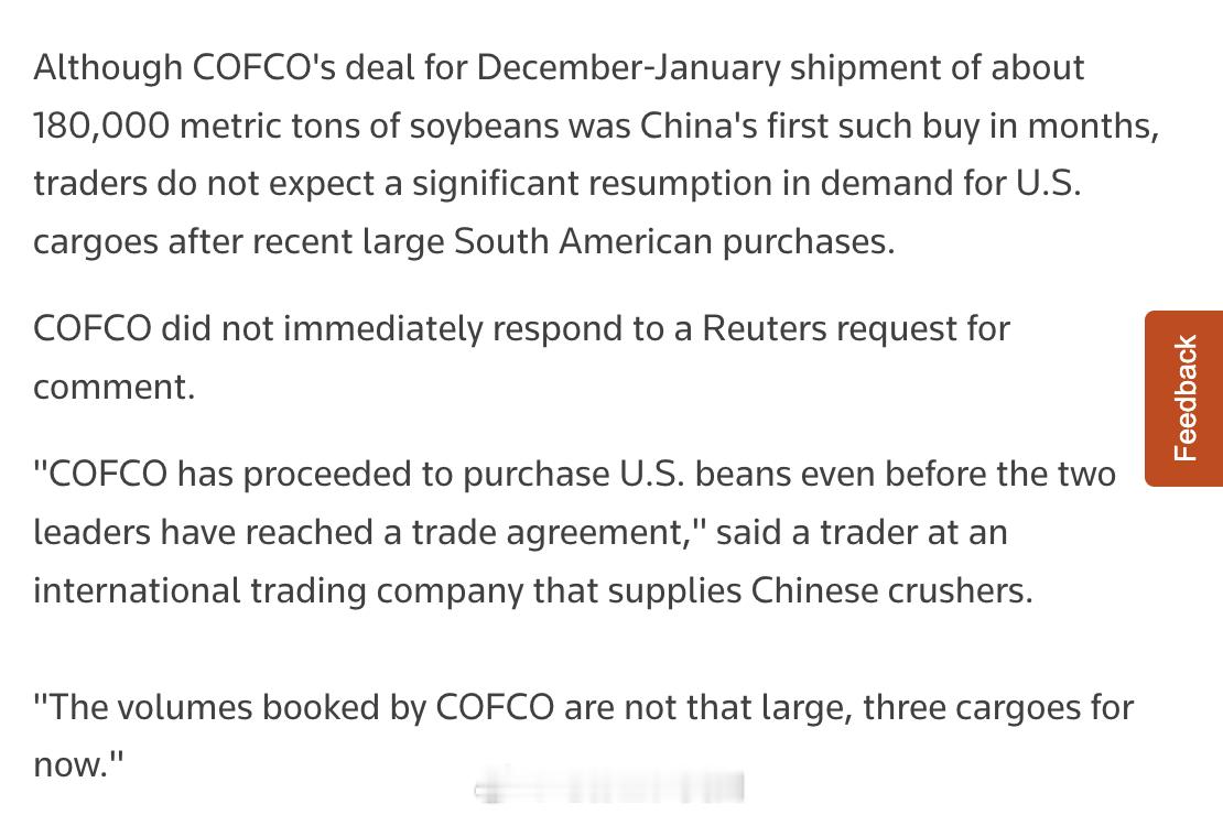 路透社:中粮集团已采购了三批美国大豆,量不大,一共18万吨。