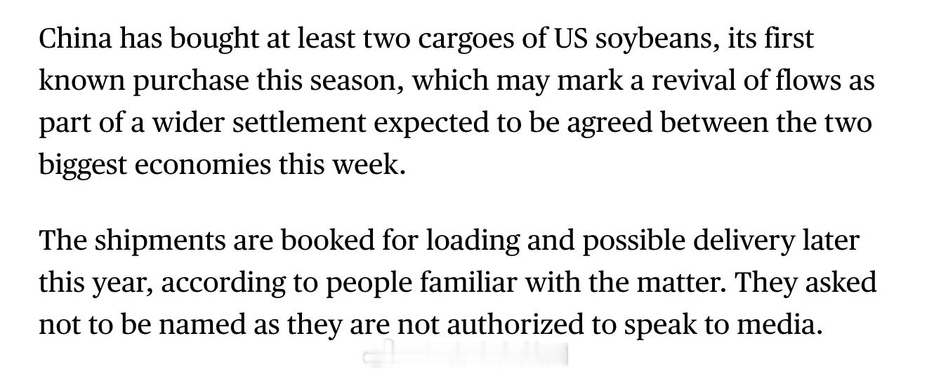 中国在本收获季首次从美国购买大豆:彭博社:中方已购买至少两批美国大豆。路透社:中