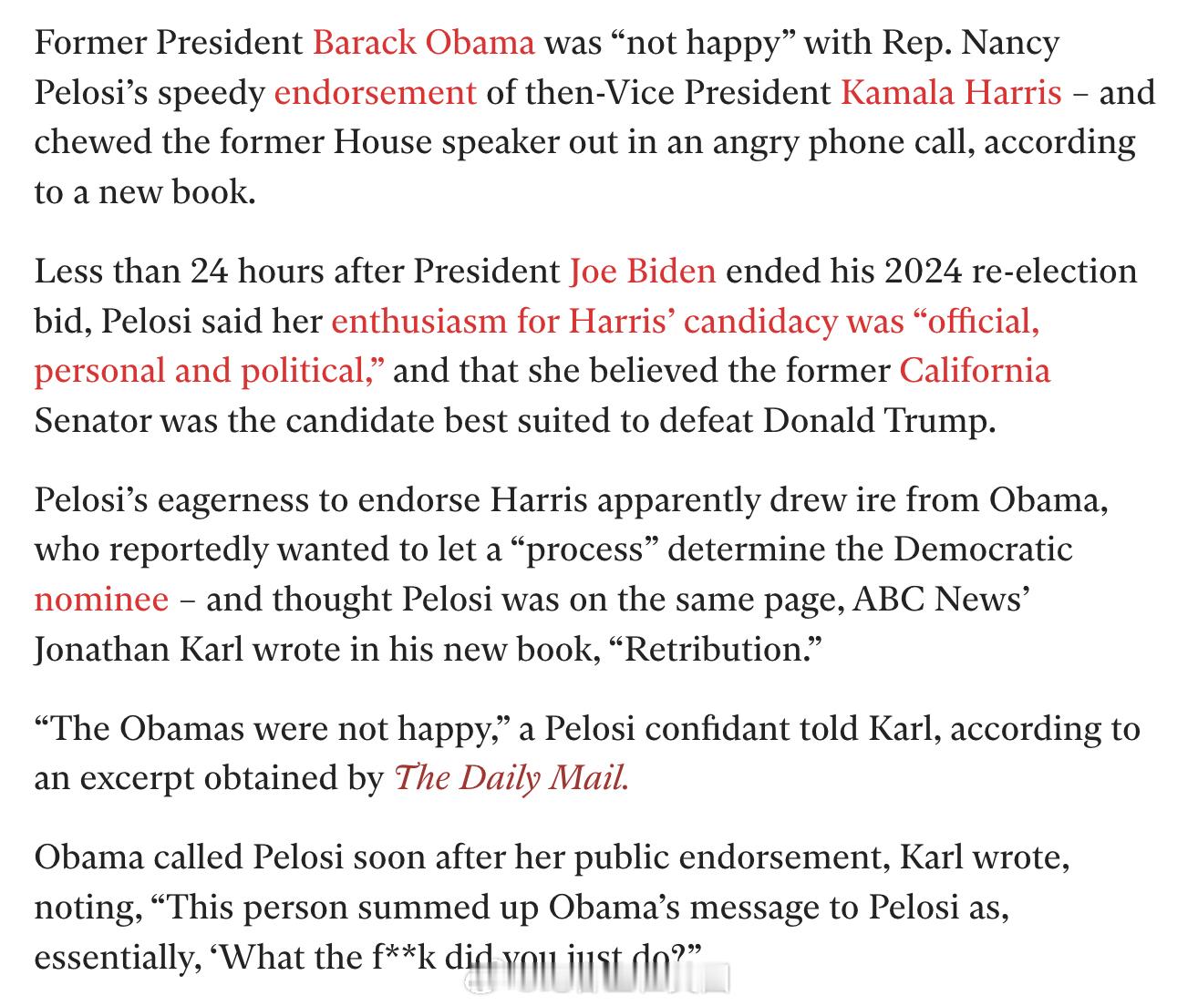 奥巴马原本希望在拜登退选后,通过一个民主程序来决定党内提名人,并一直以为Pelosi对此持相同立场。一位Pelosi的密友告诉Karl,奥巴马夫妇对Pelosi的迅速表态非常恼怒。因为在此之前,拜登越来越明显要退选,奥巴马和Pelosi一直保持定期沟通,两人当时都一致认为,不应让Harris不经竞争就自动获得提名。并且在拜登宣布退选之前,奥巴马和Pelosi曾私下同意暂不公开支持任何人。