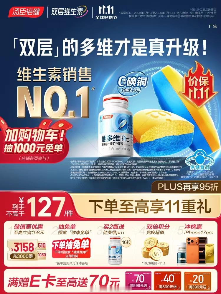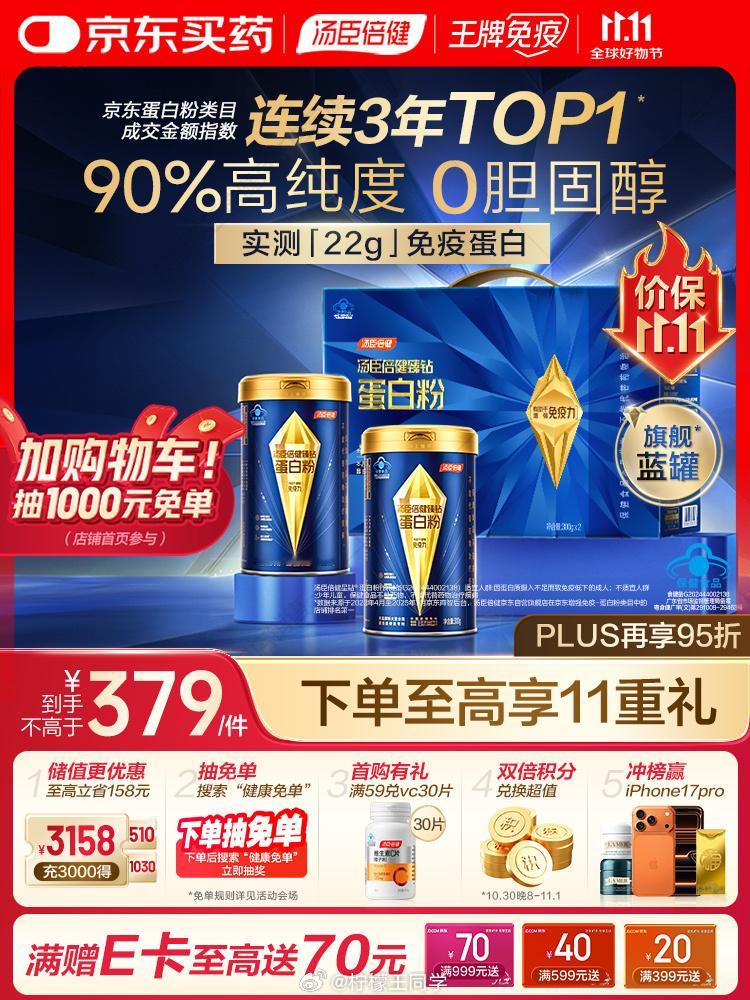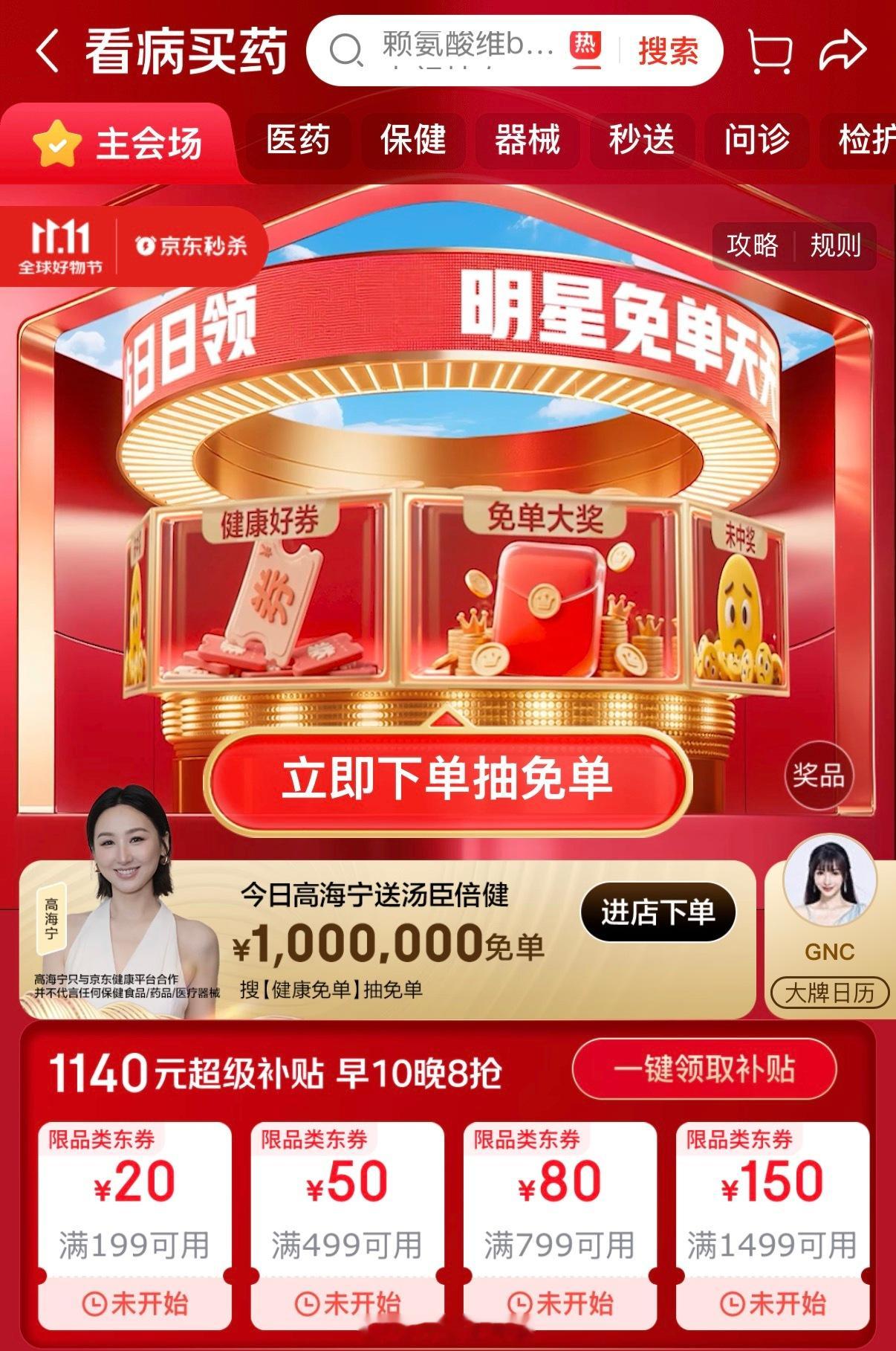 这一次是高海宁联合汤臣倍健开启大牌免单日活动,只要在京东搜「健康免单」就能参与免单,而且在汤臣倍健专场说不定还能捞到爆品秒杀价,不仅有免单还有折扣,一下子可以把家里的补品给补齐京东买药11.11高海宁送百万免单