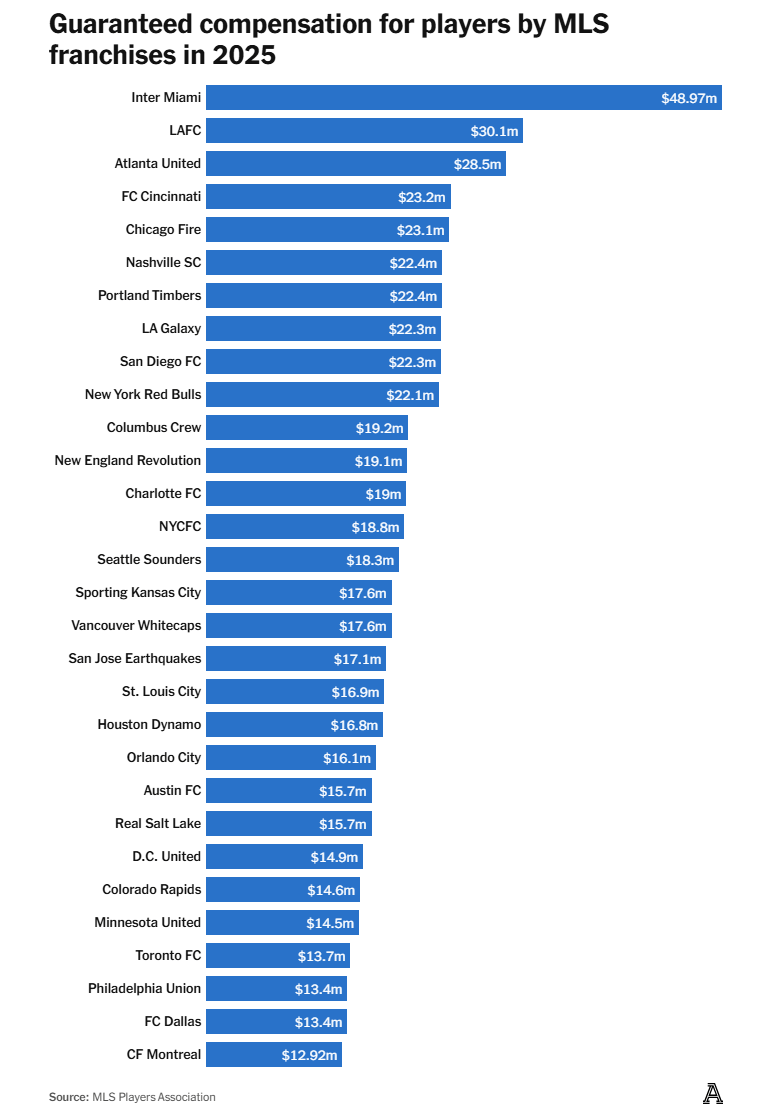 梅西或许希望MLS能够不受限制地允许投入资金,但他的迈阿密国际仍然是联盟中支出最高的球队,遥遥领先。