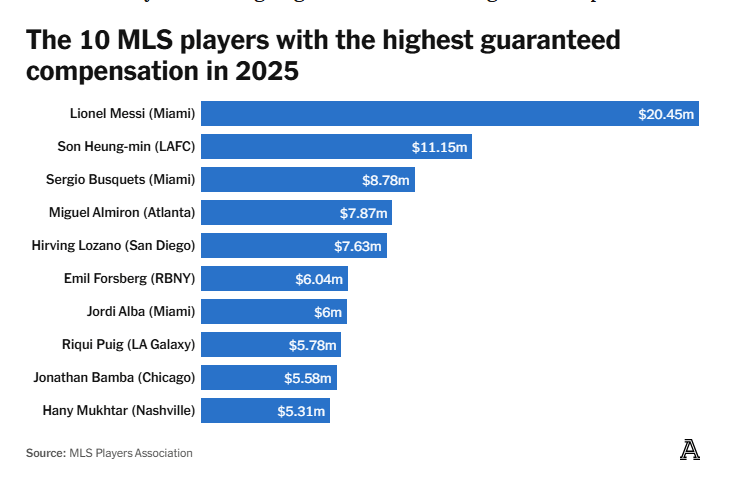 当然,不出所料,梅西仍然是联盟收入最高的球员,年薪超过2000万美元,是除孙兴慜以外其他所有上榜球员薪水的两倍多。