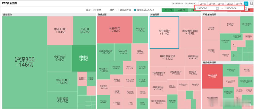 9月份ETF净申购的行业主题ETF与跨境ETF(港股),例如证券公司净申购246亿,恒生科技净申购114亿,港股通互联网净申购165亿等等。