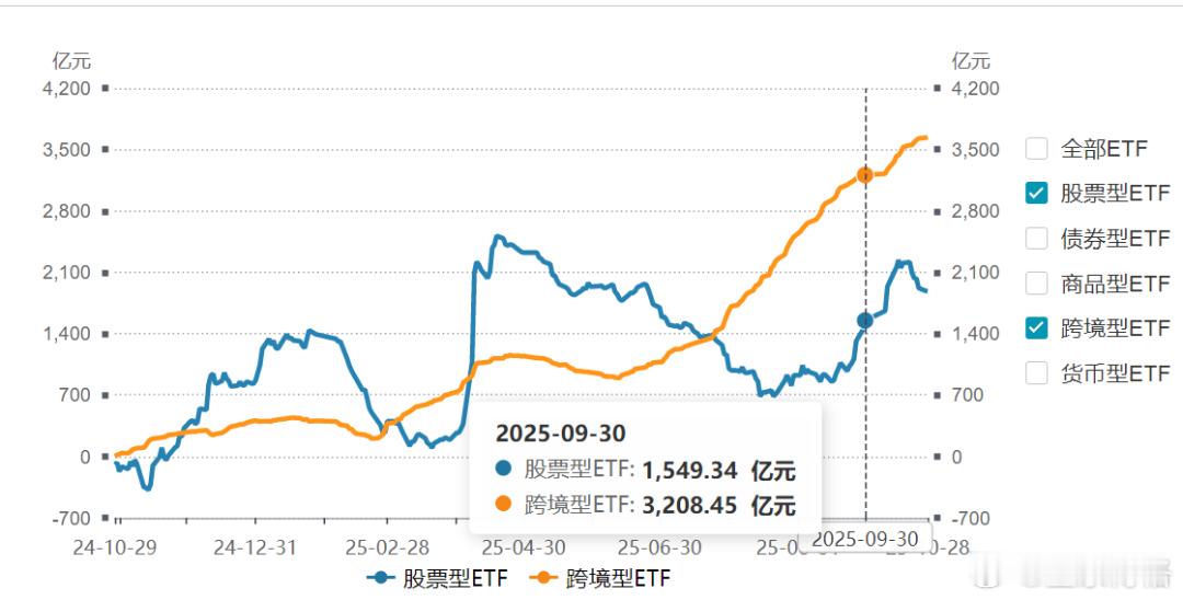 通过ETF净申购数据,我们看到9月份,股票型ETF净申购700亿,跨境ETF(港股)也净申购了700亿,两者合计1400亿,这个也基本对上了。