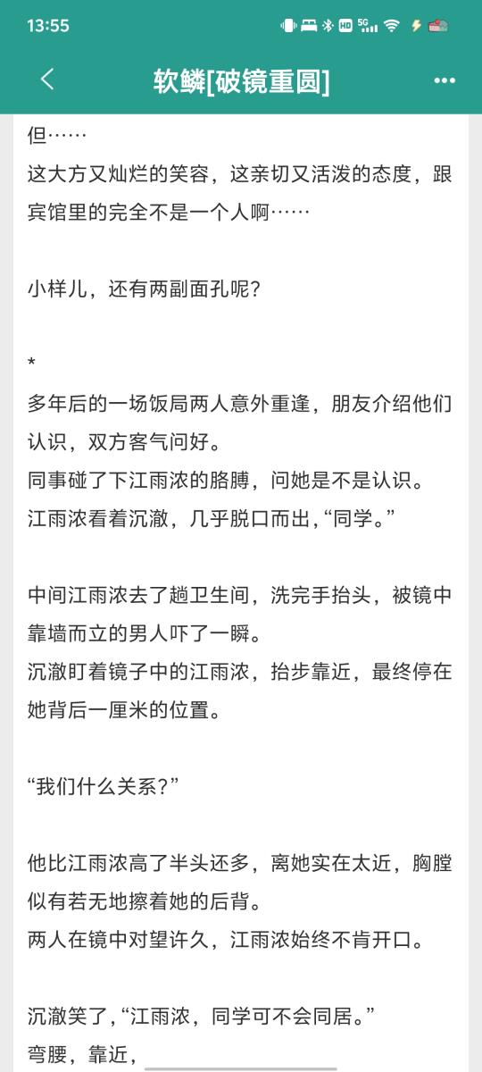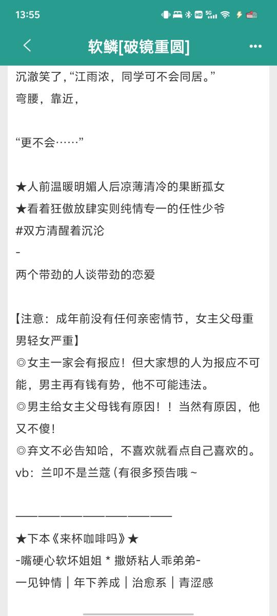《软鳞(破镜重圆》by兰叩 正文完结,在更番外 外热内冷,带感到像巨蟒的凉薄姐; 和热烈恣意,永远纯粹爱着她的固执哥 两个人初遇在小旅馆,重逢在投资饭局。 人前装不认识,人后拉扯到直接上高速!! 按这个标准完结,今年破镜重圆top有望!