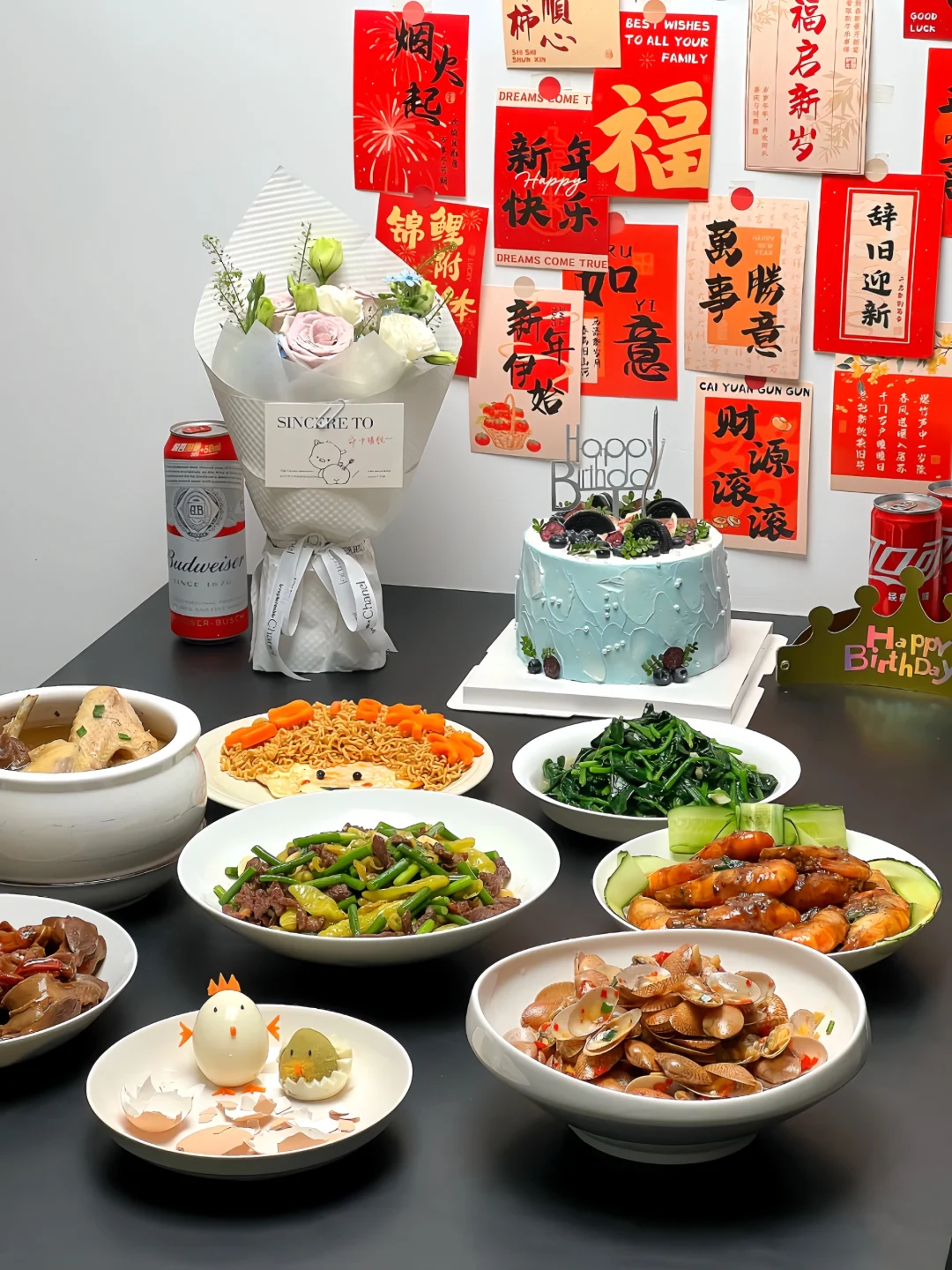 下班六点半到家 谁懂看到这一刻的含金量!! 当时看到这一桌 我还想着,今天这是啥好日子[笑哭R],男朋友怎么做了那么多菜,还有摆盘,再一看还有蛋糕🎂!!鲜花💐!!! 原来是我生日哈哈哈!!!!! 太惊喜了!!!!!!