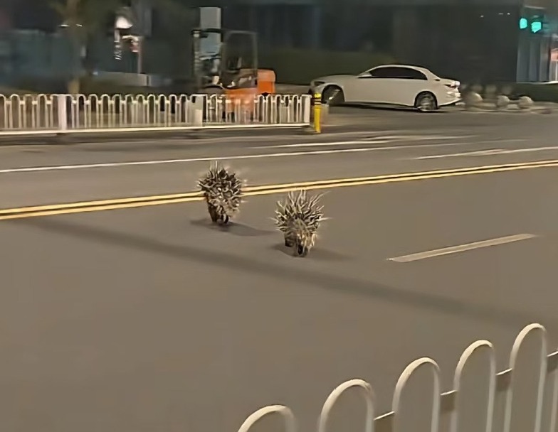 大皖新闻讯10月29日晚,有网民在社交平台发布视频,“你们看这是什么,我家门口来。”视频中,两只浑身是刺的豪猪在街头奔跑。发布视频的网民配文“越狱的豪猪”,并@南京市红山森林动物园。