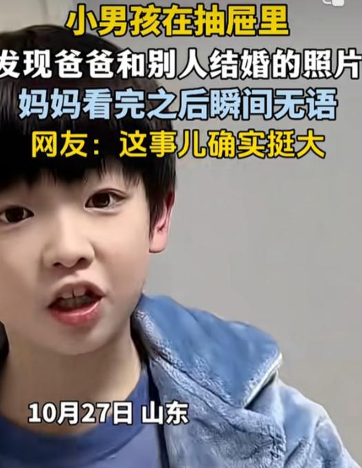 “笑不活了!”山东,小男孩在抽屉里发现爸爸和别人的结婚照片。没想到,他拿去给他的妈妈看,他的妈妈说:“这就是我啊!”不料,男孩接下来一句话,让他的妈妈感到无语。网友:这事确实挺大的。 10月27日,山东烟台的李女士正在厨房切菜,菜刀刚碰到案板发出清脆声响。 8岁的儿子小宇就攥着张硬壳照片冲了进来,手指把照片边缘捏得发皱,声音里带着哭腔,妈,出大事了!我爸书桌里藏了和别人的结婚照! 李女士手一抖,半截胡萝卜滚到地上,她慌忙在围裙上擦了擦手,快步接过来,快给我看看! 照片已经泛黄,边角有些磨损,上面穿西装的男人确实是丈夫,可旁边穿白婚纱的女人长发披肩,眉眼弯弯,看着全然陌生。 她刚要开口追问,小宇又补了句,我爸肯定骗了我们,这阿姨我从来没见过! 这张照片并非偶然发现,前几天爸妈加班不在家时,小宇就盯上了爸爸书桌最下层的木匣——那是家里的“禁地”,爸爸总说里面装着重要合同,从不让人碰。 他踩着小板凳,用妈妈梳妆台上的发卡撬开了木匣搭扣,里面除了这张结婚照,还有本红色绒面相册,翻开第一页就是爸妈在公园的合影。 妈妈穿着碎花裙靠在爸爸肩上,爸爸手里举着个冰淇淋,两人笑得眼睛都眯成了缝。 可现在两人出门都隔着半米距离,他越看越迷茫,甚至开始害怕:是不是所有人结婚久了都会变成这样?两具身体住在同一个房子里,心却像隔了十万八千里。 这种迷茫渐渐变成了沉默。在学校里,他不再和同学打闹,老师发现他上课总走神,几次问他是不是有心事,他都只是摇摇头。 他知道说了也没用,大人总觉得小孩不懂感情,可他明明看得清清楚楚,家里的空气都比别处沉闷。 直到这天翻木匣时又看到那张结婚照,他再也忍不住,攥着照片就去找妈妈对质。 傻孩子,这就是我啊,李女士终于反应过来,笑着戳了戳他的额头,眼眶却有点发热。 她拿起照片摩挲着,这是八年前拍的婚纱照,那时候我还没生你,也没这么多操心事。 小宇盯着照片里纤瘦的女人,又看看妈妈系着围裙的身影,较真地皱起眉,怎么会是你?你以前这么瘦吗? 这句话让李女士的笑容僵在了脸上,她下意识摸了摸自己的腰,她张了张嘴想解释,最终只化作一声轻笑。 李女士把这段插曲随手发在了家庭群里,没想到被亲戚转到了网上,很快引来了热议。 小宇那句童言无忌的疑问,就像一把轻巧的钥匙,打开了被日常琐碎掩盖的情感。 它提醒着大人们,那些照片里的笑容从未消失,只是需要在柴米油盐里被重新看见、重新珍惜。 家庭的温暖从不在完美的表象里,而在这些带着烟火气的误会与理解中。 就像网友说的,“这事确实挺大的”,大到能唤醒沉睡的温情,大到能让人想起:爱不是永远光鲜的模样,而是历经岁月变化后,依然愿意为彼此停下脚步的心意。