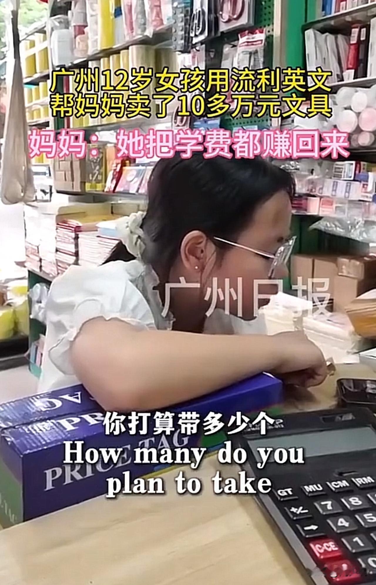 #12岁女儿讲英语帮妈妈卖文具赚10万#广州这位12岁女孩火了!流利英文帮妈卖货超10万,网友纷纷称赞:“这才是学以致用!” 广州黄沙一家文具店内,12岁女孩李若熙用流利英语和外商谈生意的视频爆红。视频里,她熟练介绍荧光笔“大品牌、质量好”,还会用“量大优惠”讨价还价,推销思路清晰老练。 女孩妈妈马女士介绍,他们是来广州打拼的潮汕人,孩子在佛山读初一。李若熙从一年级开始学英语,靠线上外教课和APP积累,词汇量达高中水平,还考了PET证书。自去年8月帮家里对接客户,已促成超10万元销售额,把英语学费都赚回来了,曾单月拿下3.5万元订单。 此事引发网友热议,有网友说:“这口语和情商绝了!比很多成年人都厉害,真是别人家的孩子。” 也有网友坦言:“学以致用的典范!学的知识能变现,还能帮家里,太优秀了。” 还有网友说:“父母引导得好,创造机会让孩子实践,这才是有效的学习方式。” 这位12岁小女孩的走红,在周少看来,不仅因流利英语,更在于她将知识转化为能力的实践力。在“死读书”争议不断的当下,她的经历证明,语言学习需结合实际运用,父母主动创造实践机会也至关重要。这股“学以致用”的正能量,值得家长和孩子借鉴学习。 对于这位12岁女儿讲英语帮妈妈卖文具赚10万,大家怎么看呢?#寻美三湘# #长沙新朋友#