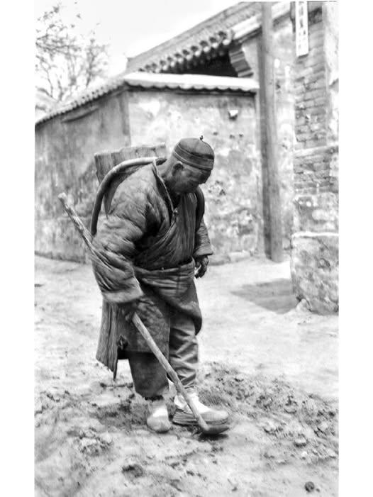 这张照片定格了清末一位街头拾粪老汉的身影,他头戴瓜皮小帽,身着打满补丁的暗沉旧棉