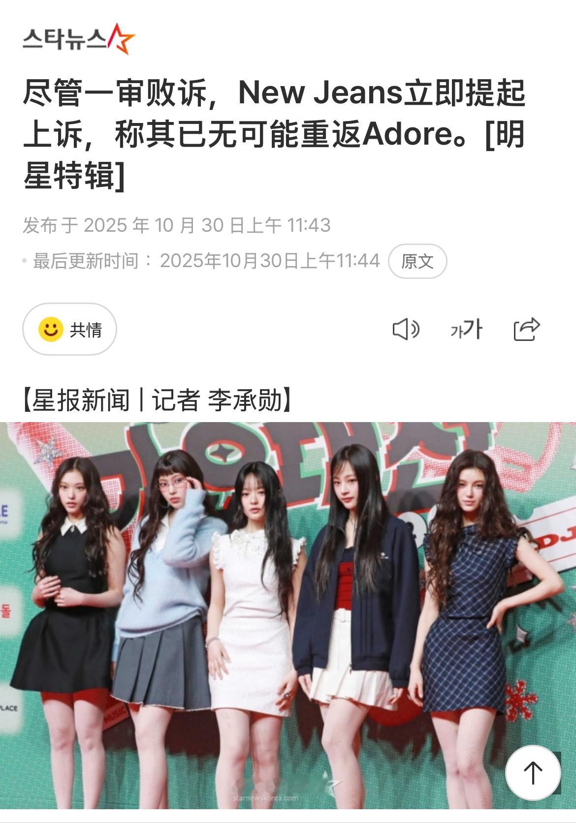 NewJeans终审Newjeans称与ADOR信任关系破裂 法院裁定NewJeans与其经纪公司ADOR之间的独家合约仍然有效,Newjeans不满结果提出上诉。