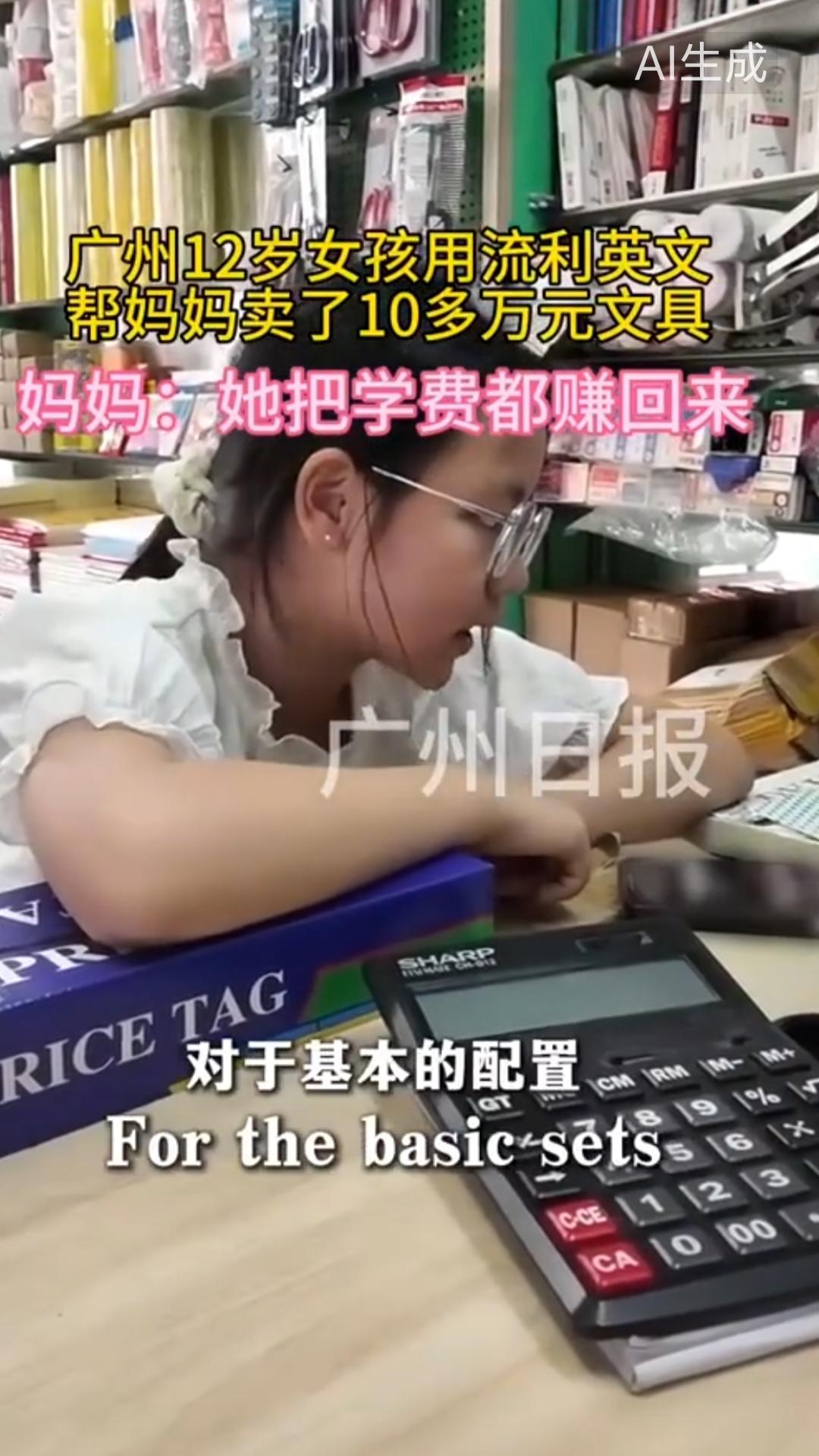 家庭教育还是要学广州这家人 10月24日,广州一家文具店内,一名12岁女孩用流利英语与外商交流推销荧光笔的视频在网上走红。 这孩子真是厉害,学了英语马上用上了。人家妈妈说孩子从去年8到今年10月已经向外商卖出10万多的货,报兴趣班的钱早挣回来了。这孩子英语学不好才怪呢,这么一练习听说这两个短板也补上,而且还为家里挣钱。 回过来再看看自己的孩子兴趣班也没有少报,收效一般般大多都还给老师了。学了就用,这才是完美的学习。