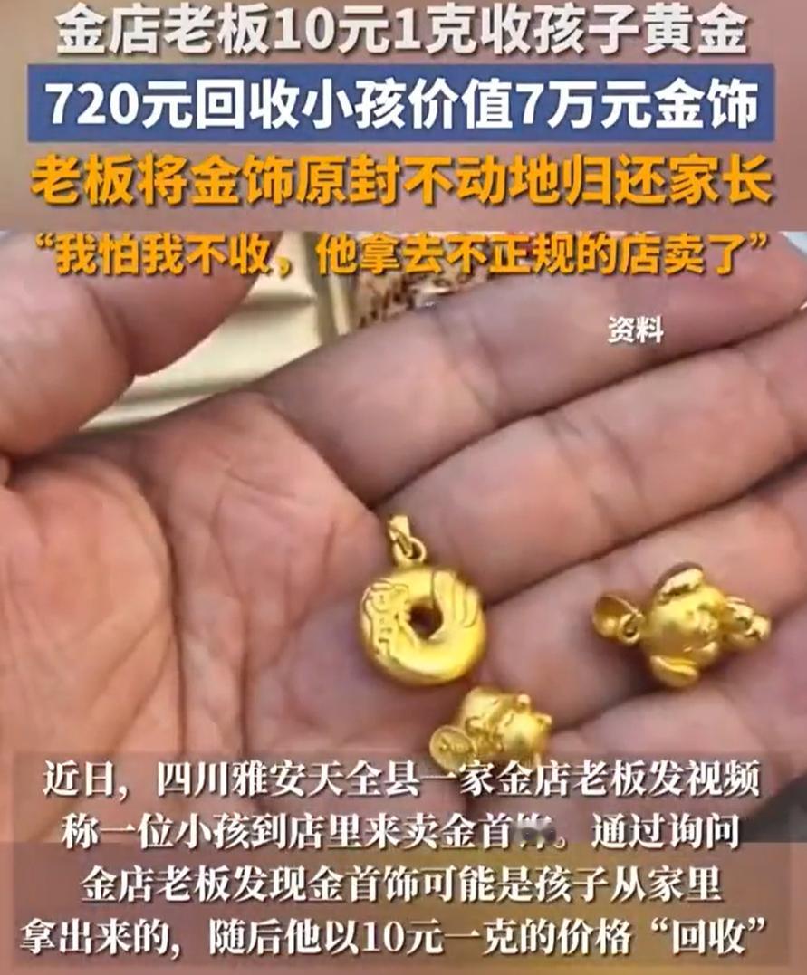 四川雅安,一名小男孩独自走进金店卖黄金,简单询问后,金店老板以10元1克的价格,用720块收下了孩子将近70000块的金首饰,不过并没有留下,而是在孩子离开后又主动归还给孩子的家长,原来,老板只是怕自己不收,孩子找到不正规渠道卖了 老板介绍,当天男孩独自走进店里,从兜里掏出几件金首饰,说要卖掉。老板接过来一看,东西不轻,成色也不差。他问了孩子几句,心里大概明白了,这金首饰,多半是从家里拿出来的 孩子说不清来历,老板也没戳破。他按10块钱一克的价格算,总共720元,把钱给了孩子。孩子拿着钱走了,金饰却还留在柜台上,老板根本没打算真收 他怕的是,要是直接拒绝,孩子可能转身就去找别家,甚至找到不正规的地方去卖。那样的话,这些东西可能就真的找不回来了 老板留了个心,几经周折联系上了孩子的家长。没多久,家长赶来店里,老板把金饰原封不动还了回去。这时大家才知道,这些金饰的实际价值接近七万块 不得不说,这个老板的做法真的是有心了,店主知道,这种年纪的孩子很容易被外面人忽悠,如果自己不收,孩子可能去别的地方卖,自己都能用10元一克的价格“收”下来,要是真遇到黑心商贩,那结果可想而知,那一瞬间,店主的“收货”其实是保护 这事也提醒家长,别太放心孩子能分清是非。金首饰这种东西,在孩子眼里可能只是闪亮的玩意儿,不懂它背后的价值和分量。孩子拿出去卖,未必是贪钱,更多是好奇,或者想换点零花 教育的意义就在这儿,不是靠训话,而是让孩子明白什么能碰,什么不能动
