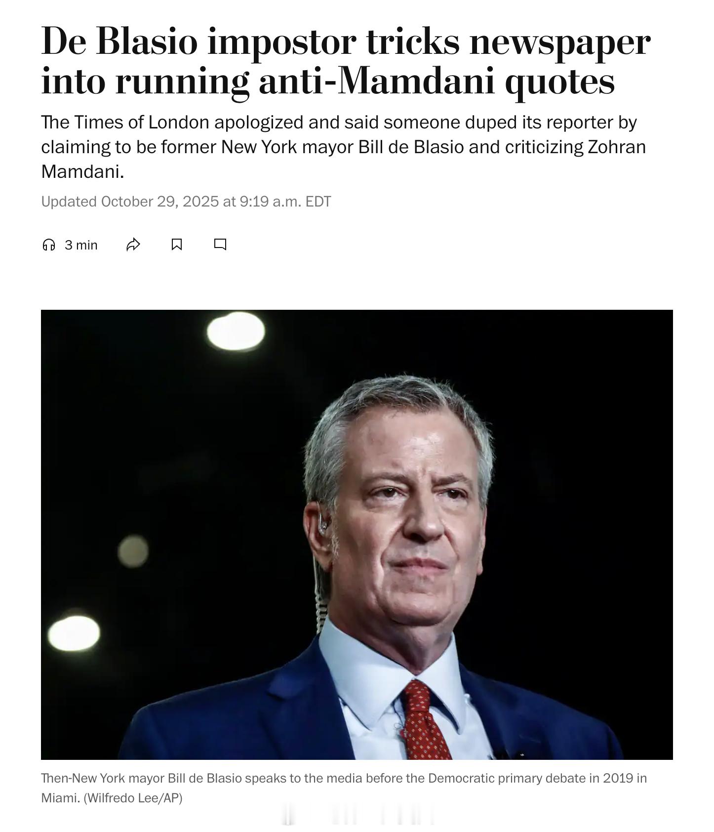 日前删除了一篇独家采访文章,内容是有人假借前纽约市长白思豪名义批评市长候选人Zohran Mamdani,经查实这些言论是冒充者伪造的。
